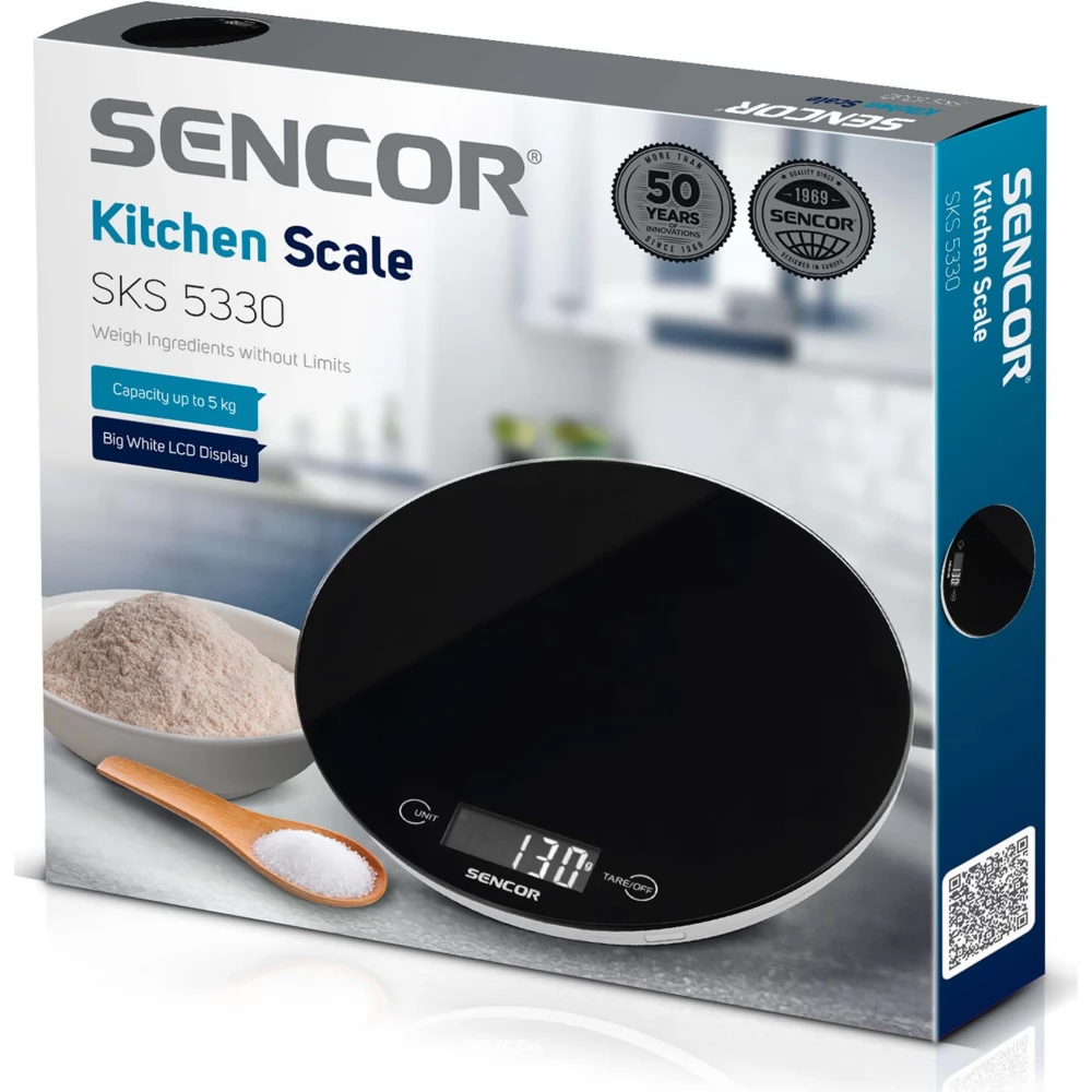 The Sencor SKS 5330 digital scale is an ideal helper in the kitchen. High quality, black and white color combination with a special anti-fingerprint coating. Extremely slim design, only 18 mm high. Thanks to the unit conversion system, you can easily determine the volume of water and milk in milliliters, and solid ingredients in grams or pounds. The maximum accuracy of the measurement is ensured by 4 integrated sensors. In case of overload, the device will notify you.