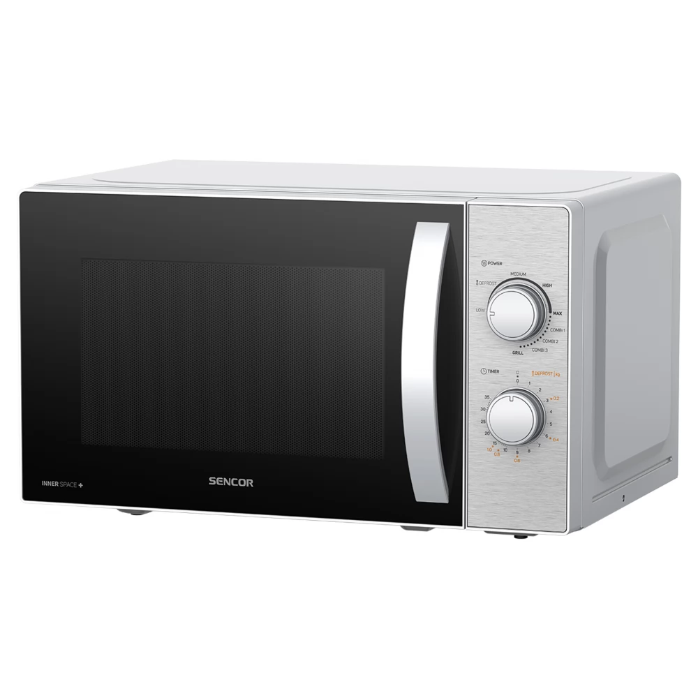 The Sencor SMW 4320SS is a freestanding microwave oven with a clean, yet elegant appearance. The device, capable of up to 700 W microwave and 1,000 W grill power, is manually controlled. In addition to the 20-liter capacity, it is equipped with five different levels, the defrost function is also available, and a timer of up to 35 minutes has been installed. Handling and keeping it clean is easy and simple. The turntable has a diameter of 255 mm.