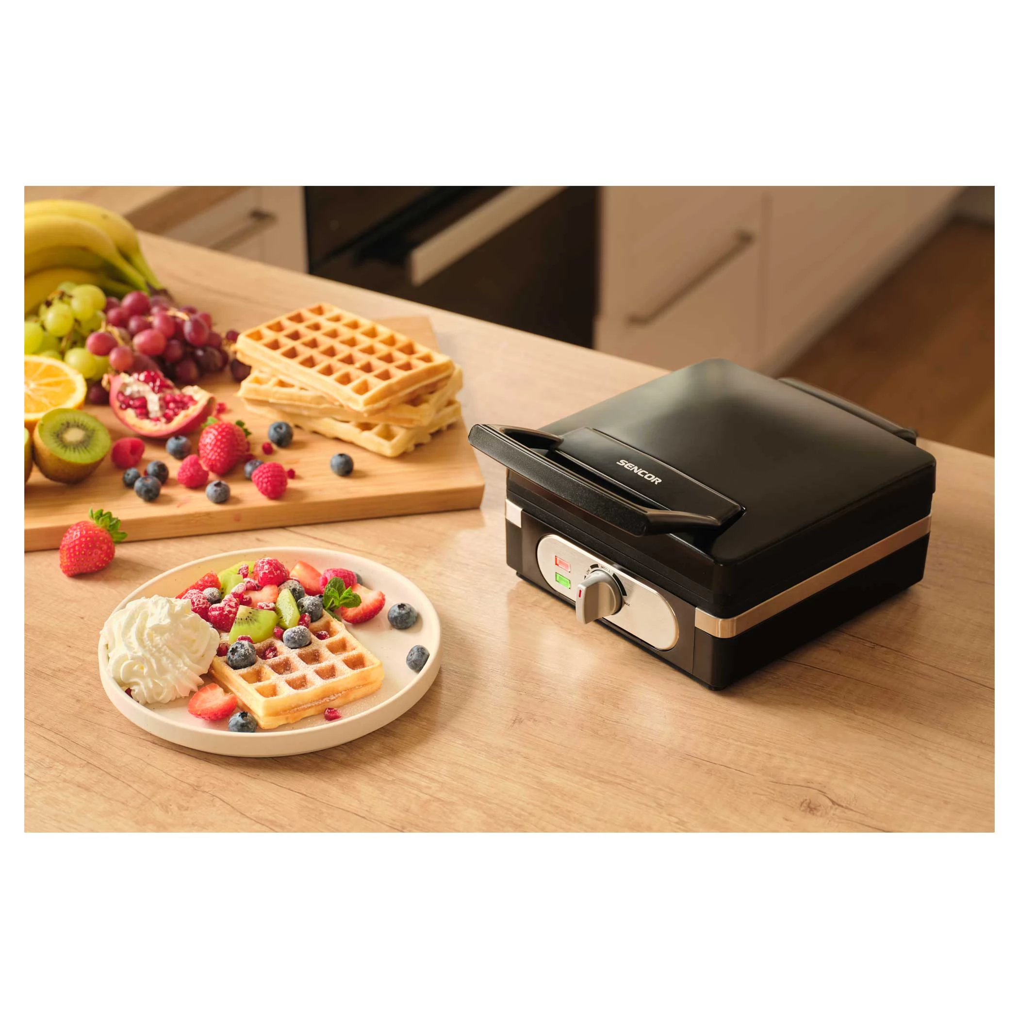 The Sencor SWF 2010BK waffle maker allows you to make two perfectly sized (85 x 145 mm) Belgian waffles at the same time. Whether for a morning dessert or a weekend brunch, with this machine you can always create delicious, golden-brown waffles on the table.