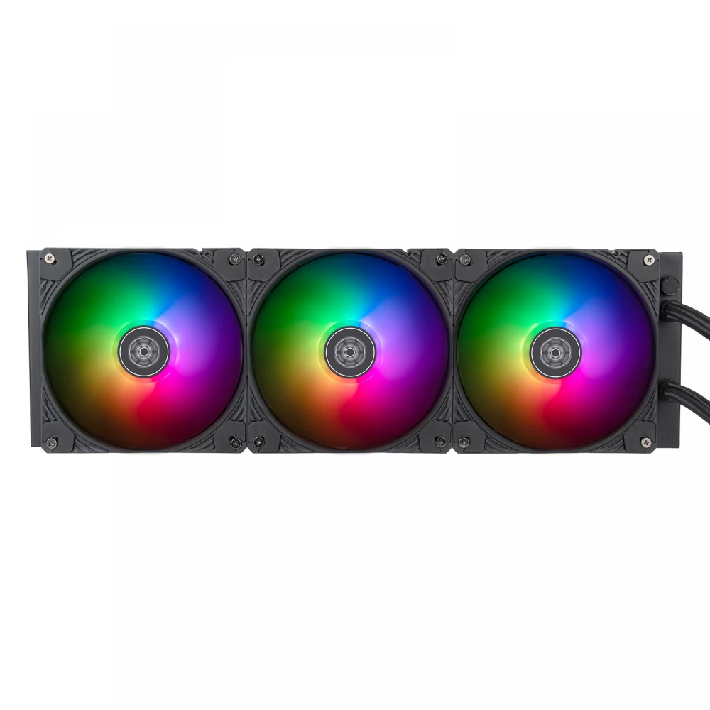 Compact, universal, water cooling with 3 140mm PWM speed controlled and controllable ARGB lighting fans and also controllable ARGB lighting CPU water cooling block. The special feature of the water cooling is the integrated lighting control (10 pre-stored modes), the rotatable CPU cooling block cover, the simplified cabling, the copper CPU contact surface with a slightly convex surface (closer contact) and high-pressure fans optimized for cooling the radiator.