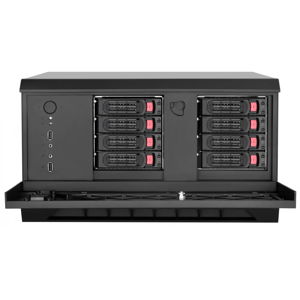 - Hot-swappable drive trays support up to eight 3.5” or 2.5” SAS-12G / SATA-6G drives with two LED displays to show drive status