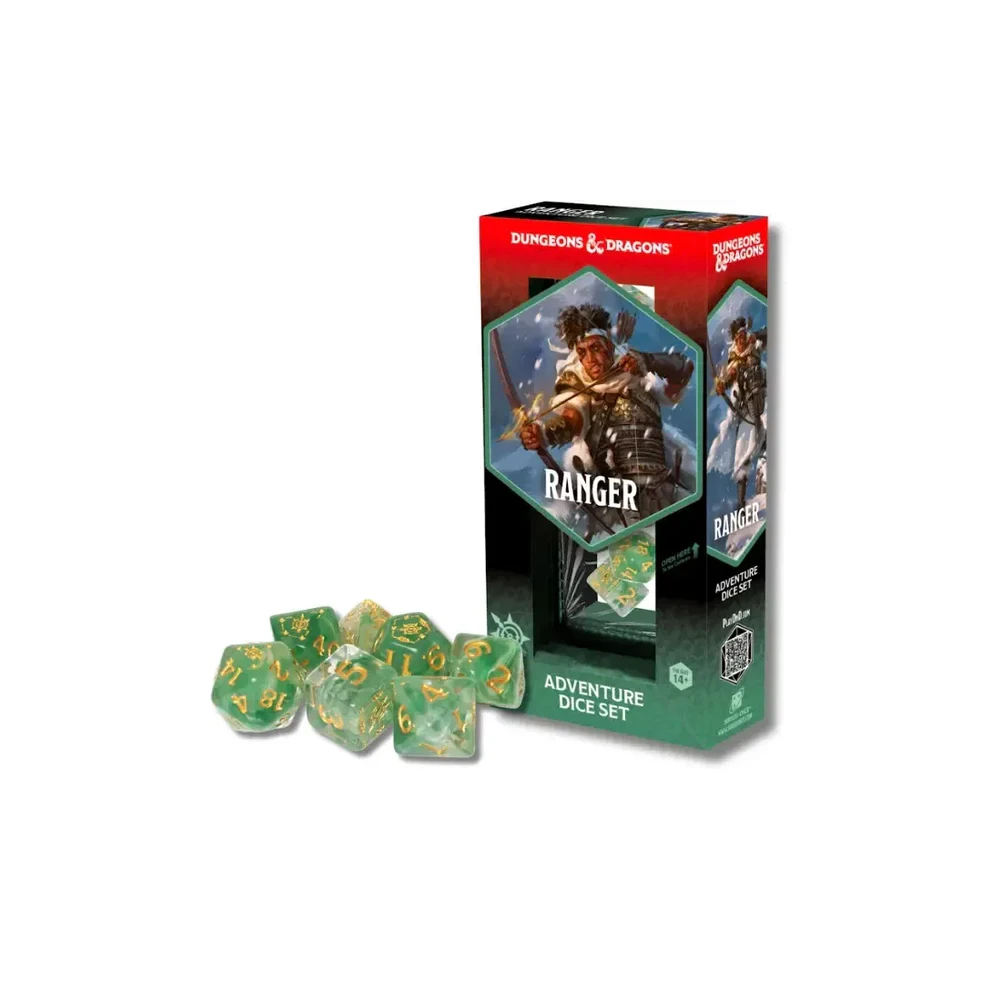 Forest green D&D dice set with gold numbers for ranger caste players. The Ranger Adventure Dice Set contains 14 dice tailored to the caste's versatile, tactical playstyle, officially licensed by Wizards of the Coast.