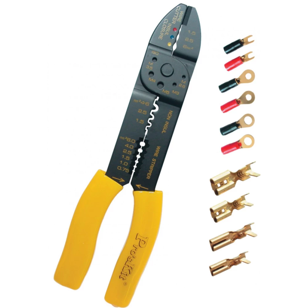 The 230 mm size 8PK-313B universal crimping pliers are excellent for crimping insulated and non-insulated crimps. Insulated: red (up to 1.5 mm²), blue (up to 2.5 mm²), yellow (up to 6 mm²). Uninsulated: 1.5/2.5/- up to 6 mm². The tool is also suitable for cutting wires and stripping cables: up to 0.75 - 6 mm². Choose the quality products and order from our online store.