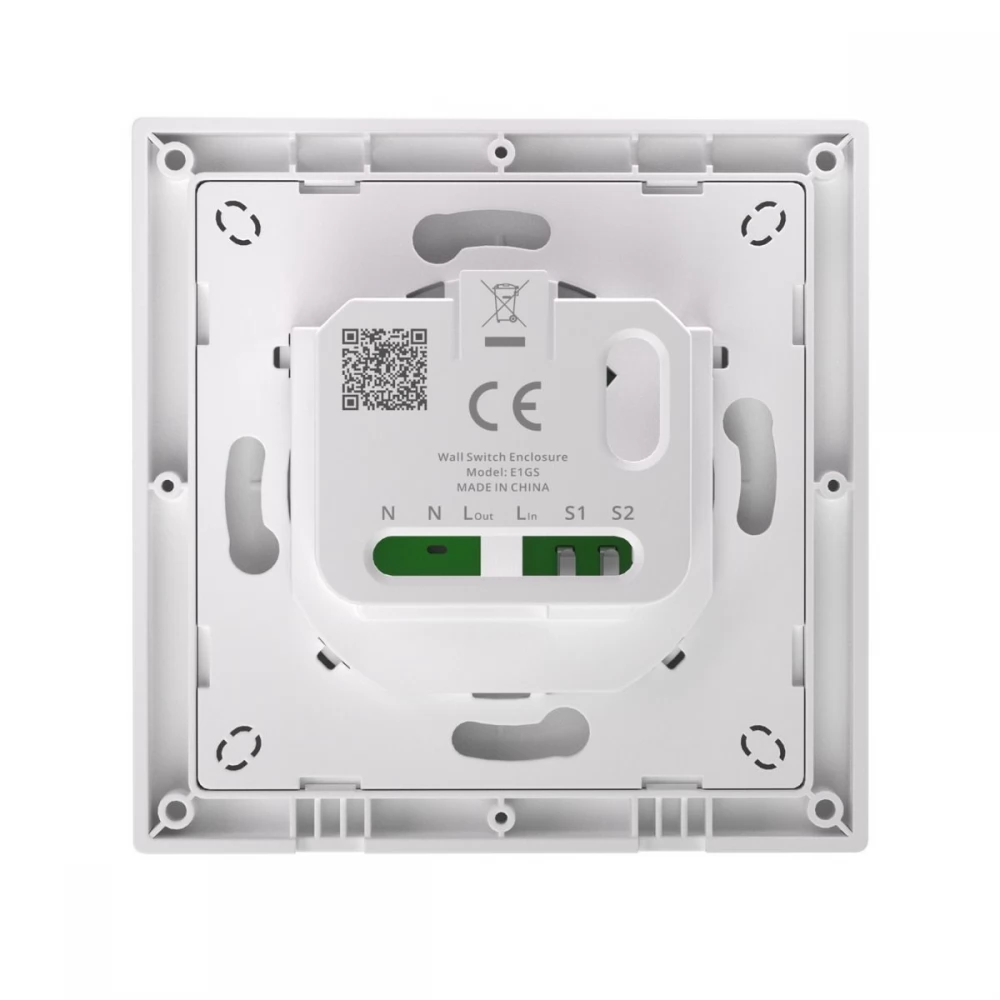 SONOFF E1GS is an additional switch specially designed for SONOFF MINIR4, MINIR4M and ZBMINIR2 retrofit modules and serves as a physical switch for them. Its mini rear design not only ensures perfect compatibility with type 86 binding boxes and European standard round binding boxes with a diameter of 60 mm, but also adapts to most shallow binding boxes available on the market, thus easily solving the problems arising from the lack of space that often arise when installing a traditional retrofit module.