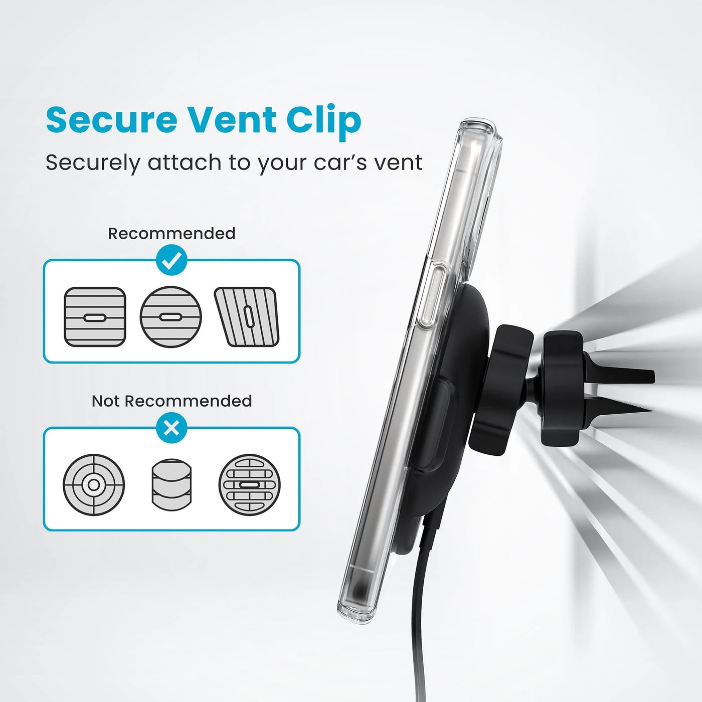Upgrade your phone's journey with the ClickLock™ charging port holder for MagSafe®. This innovative mount combines magnetic attraction with a mechanical lock to keep your phone securely attached on even the roughest of roads. Enjoy up to 15W wireless charging, while the 360° adjustable ball joint and secure ventilation clamp ensure the perfect positioning of your phone. The one-handed attachment, USB-C to USB-C cable and design that fits into the air vents of most cars make it the perfect co-pilot for any journey.