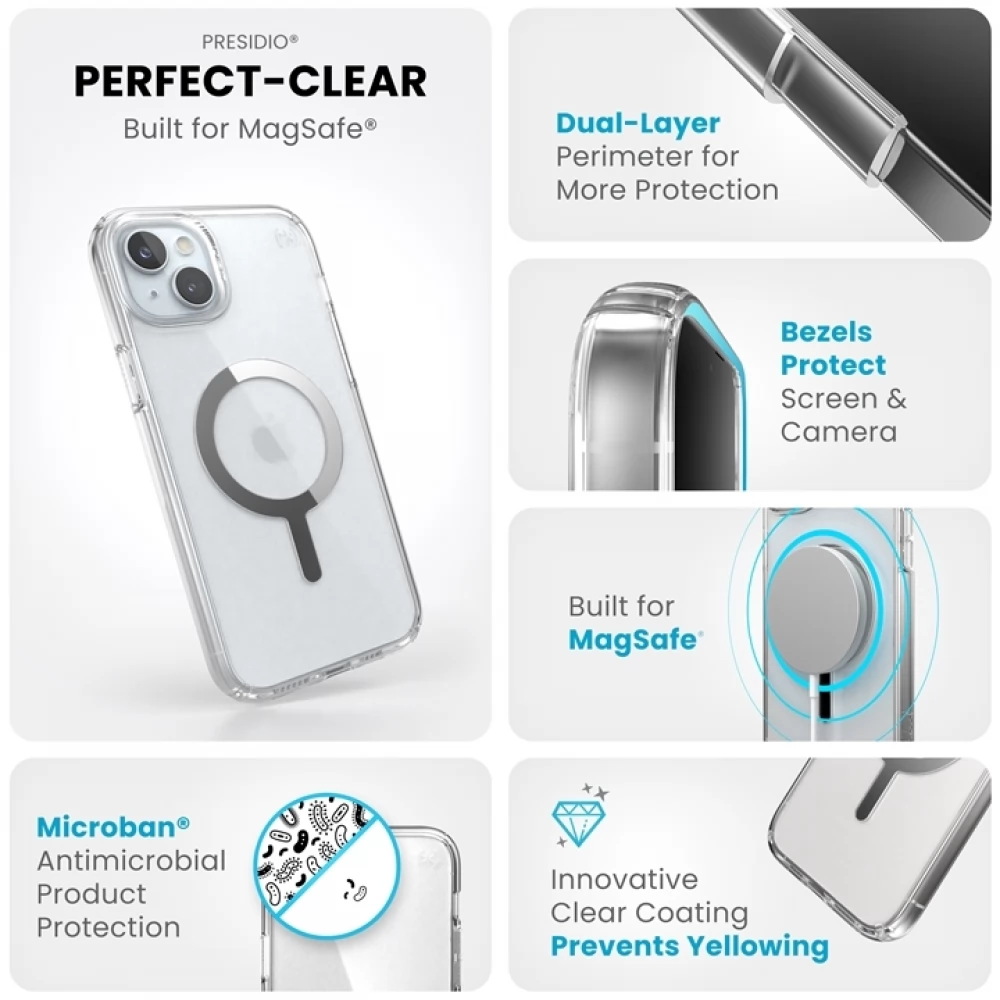 Speck 150565-3240 Presidio Perfect Clear + MS, Magsafe-Recording, Microban Anti-Bacterial Technology and Complete Crystal Clean Cleaned IPhone 15 Plus and iPhone 14 Plus 14 Plus TOK-Clear/Clear/Clear/Clear/Clear