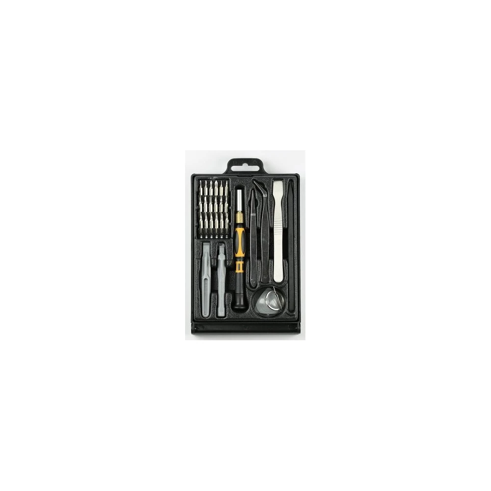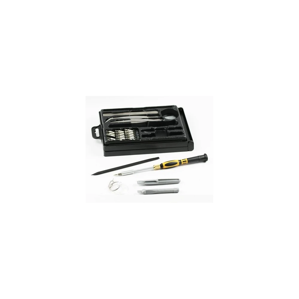 High quality precision assembly kit. Manual assembly tools. Easy handling, light weight and small size. Professional screwdrivers that allow you to remove the cover of mobile phones easily and without damage. Handle: Aluminum alloy. SIM card opening tools, tweezers. Scraper tool for soldering. In a plastic box