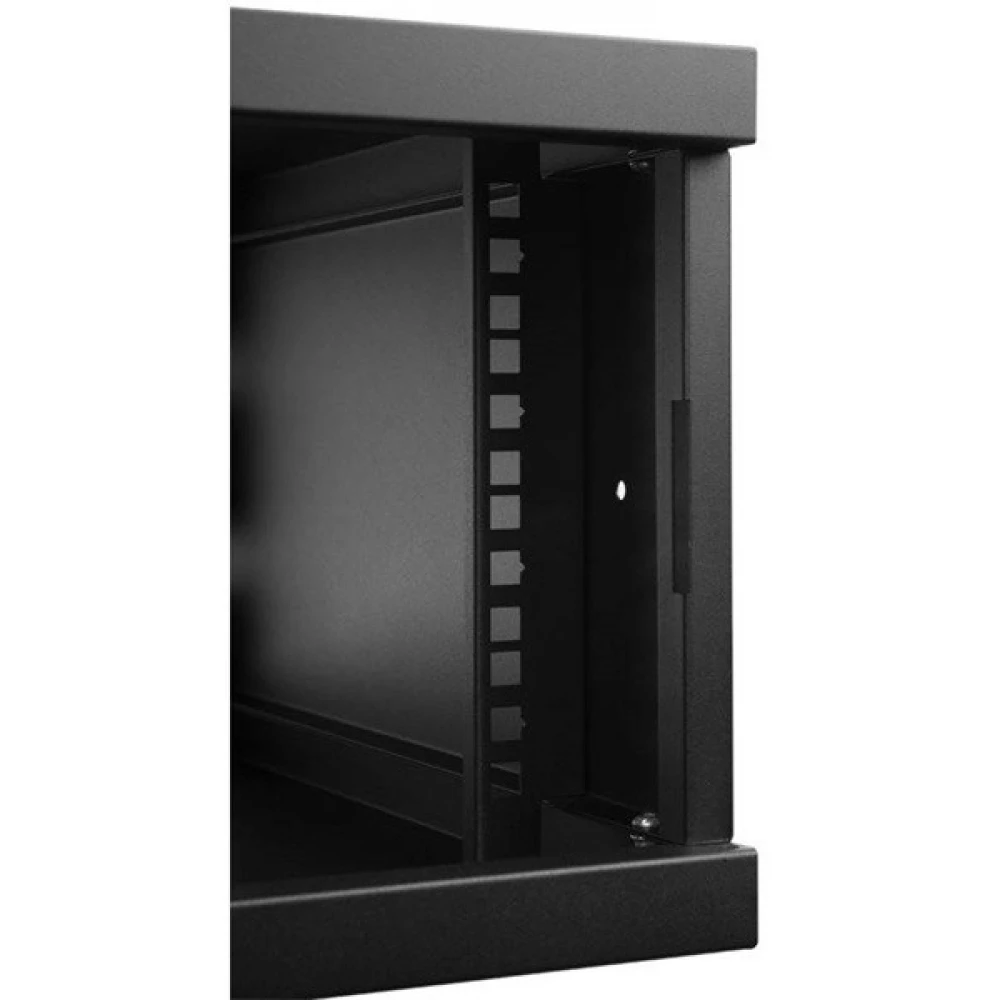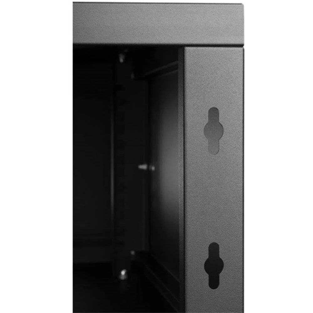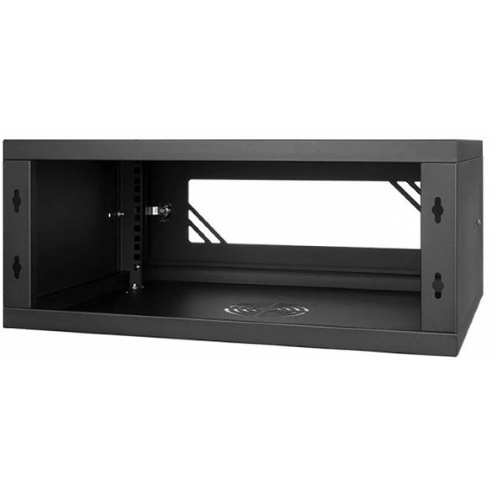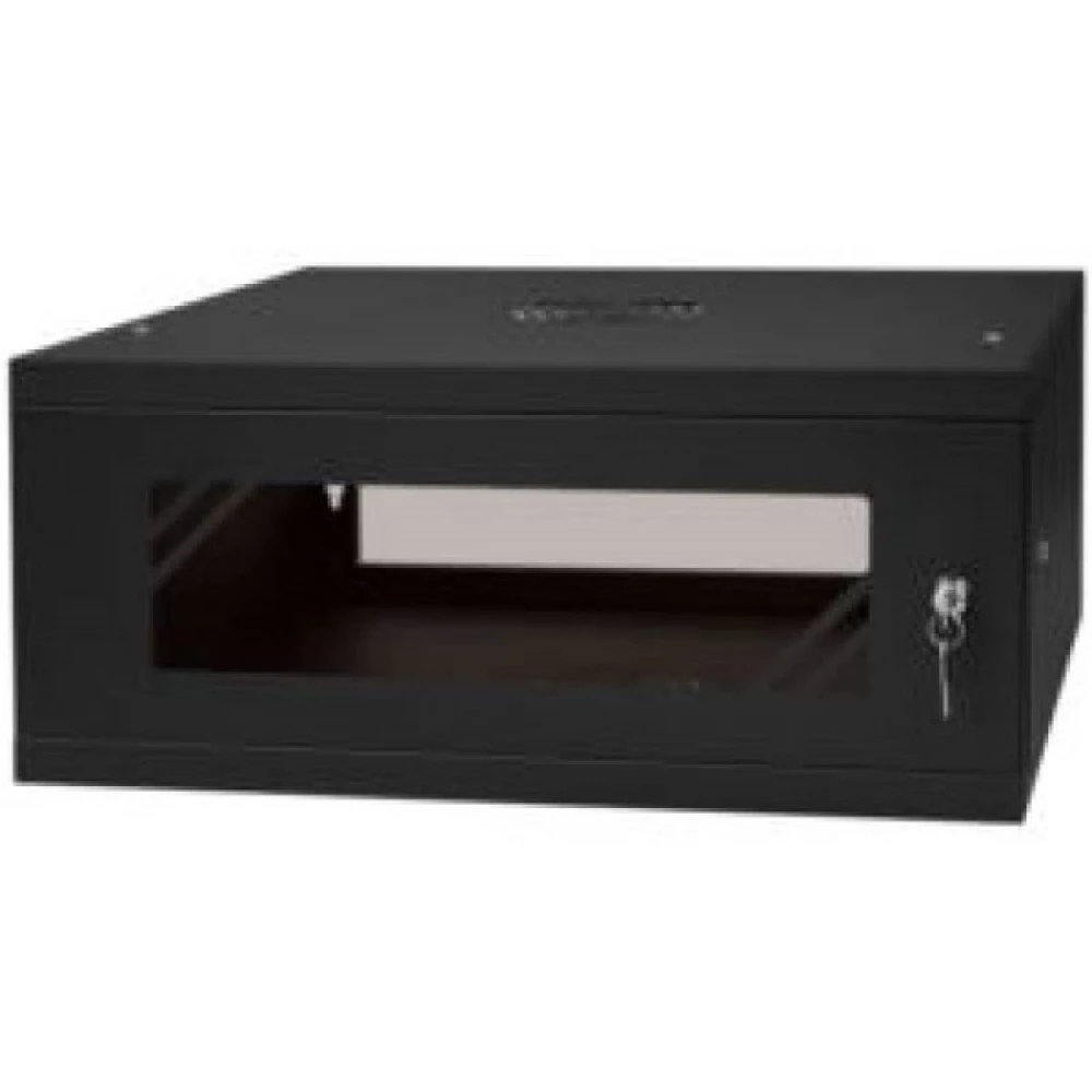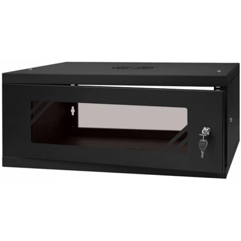 19" 4U 350 mm deep plate-mounted wall rack cabinet with black glass doors.