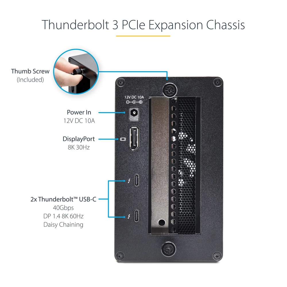 - THUNDERBOLT 3 PCIE EXPANSION CASE: Add PCI Express support to a Thunderbolt 3/4 capable laptop/desktop; Dual external PCIe 3.0 x16 expansion slots; 32 Gbps combined bandwidth (up to 21.6 Gbps/2700 MBps per slot); 3.3 ft. (1 m) Thunderbolt cable included