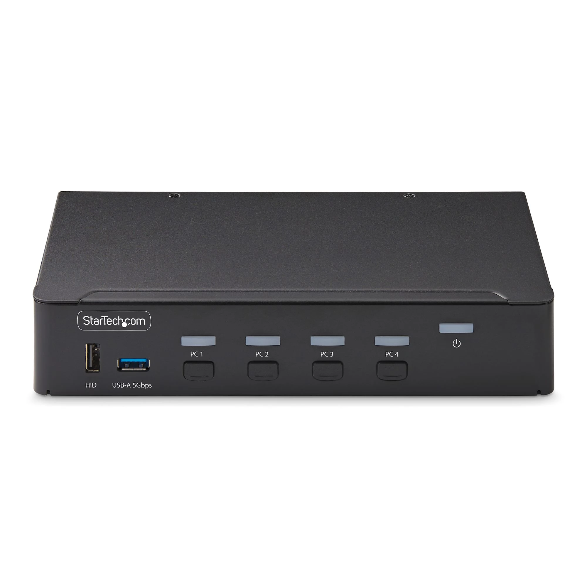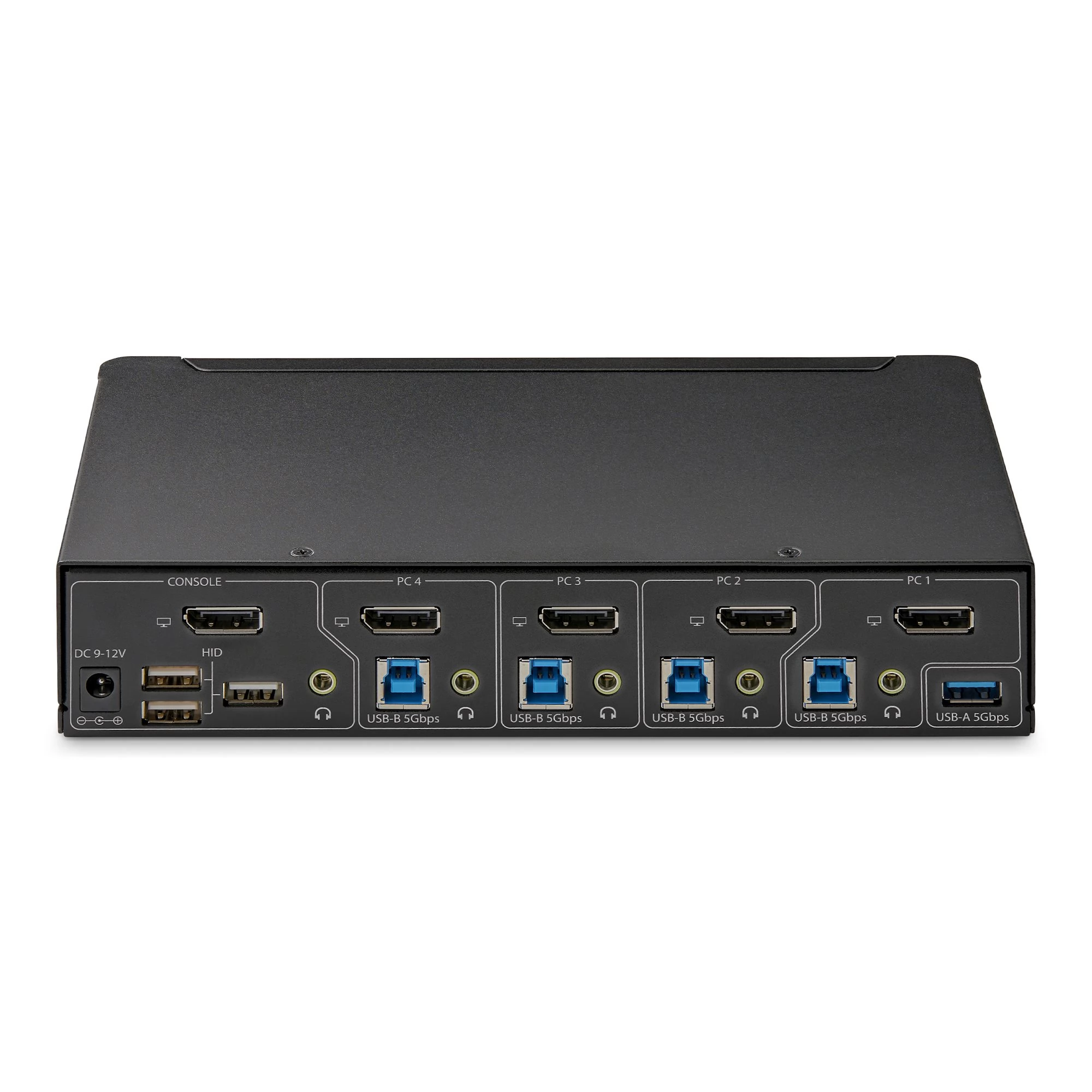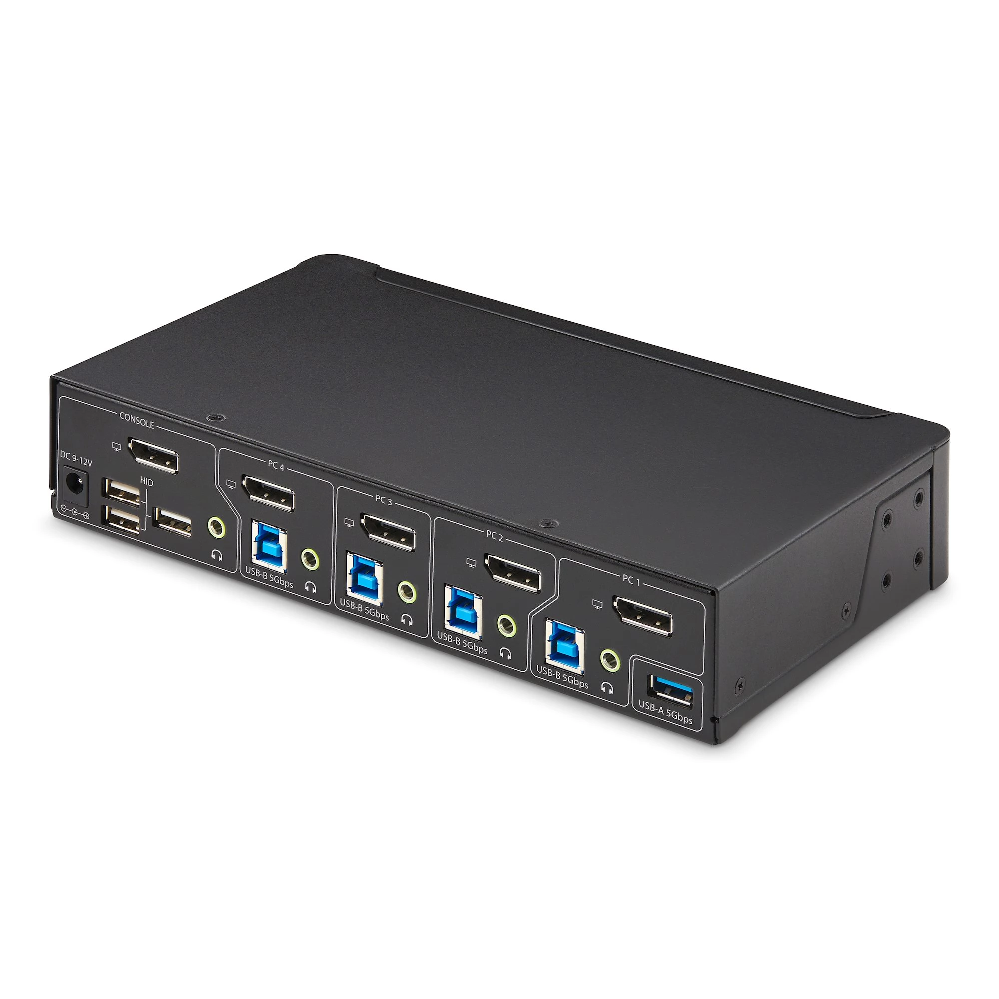 This DisplayPort KVM switch allows users to switch between four desktop computers equipped with USB-A and DisplayPort ports. Allows sharing of a 4K 60Hz DisplayPort monitor, keyboard, mouse, two USB 5Gbps devices, stereo audio output device and four USB 2.0 devices.