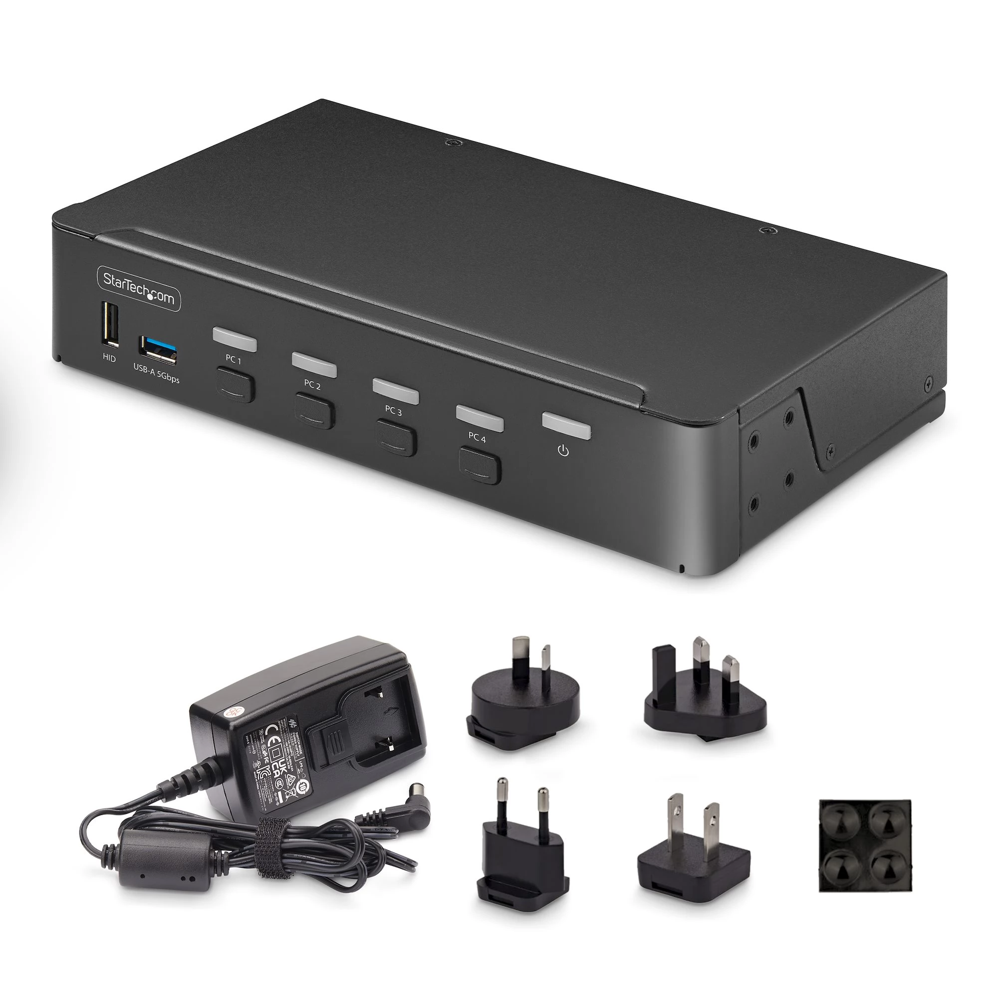 The solid metal housing helps prevent electromagnetic interference (EMI). 8kV Air/6kV Contact ESD protection increases the reliability and longevity of the KVM. The included set of rubber feet protects the work surface from scratches and keeps the KVM in place during operation.
