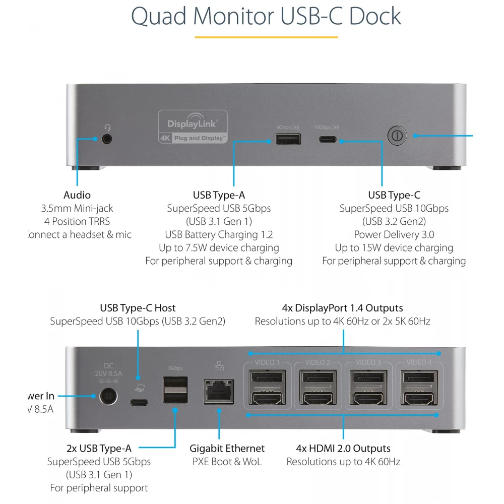 STARTECH USB C Dock - 4K 60Hz Quad Monitor DisplayPort & HDMI - Universal USB-C Docking Station with 100W Power Delivery