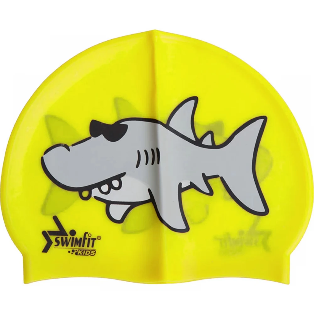 Children's swimming cap with a printed shark pattern. Recommended for leisure use. It is characterized by a high degree of flexibility. Silicone swimming caps are less damaged by chlorinated water than latex or textile caps.