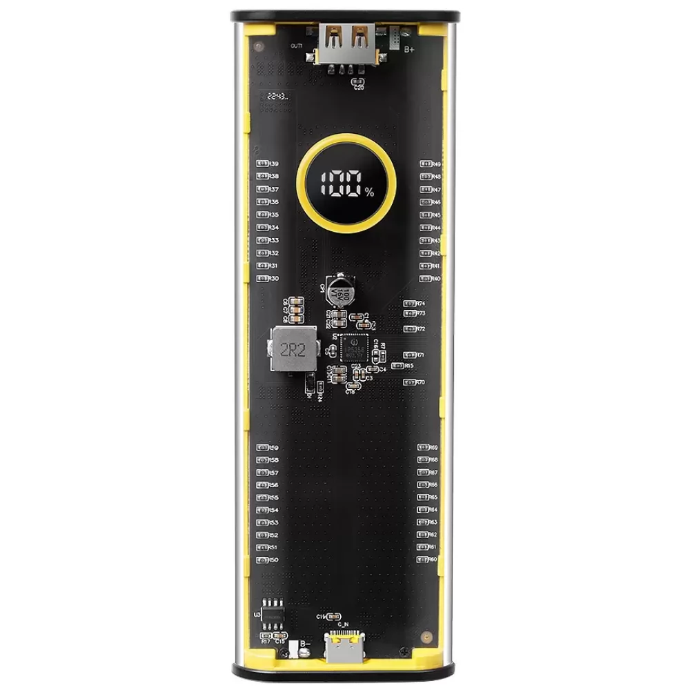 The cover of the power bank is provided by a thick layer of highly durable transparent shell that withstands everyday wear and retains its cyberpunk style. It has a built-in display. Pressing the top button shows the charge level.