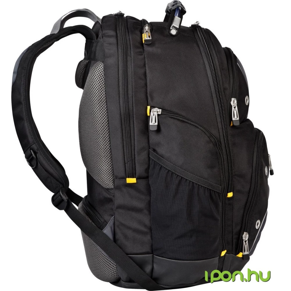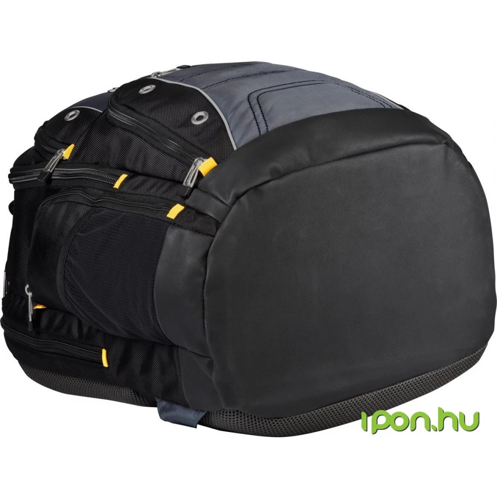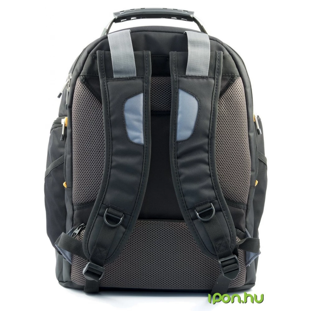 Fashionable black 15.6" backpack with gray insert, reinforced handle. Many storage compartments, including a pocket on the back where you can put more valuable things. Comfortable shoulder strap and padded back.