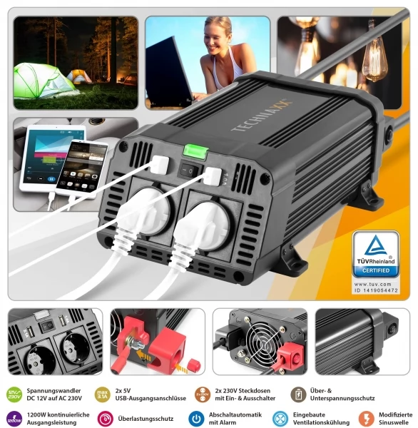 - Output power max. 1200 W (continuous) and 2400 W (peak)