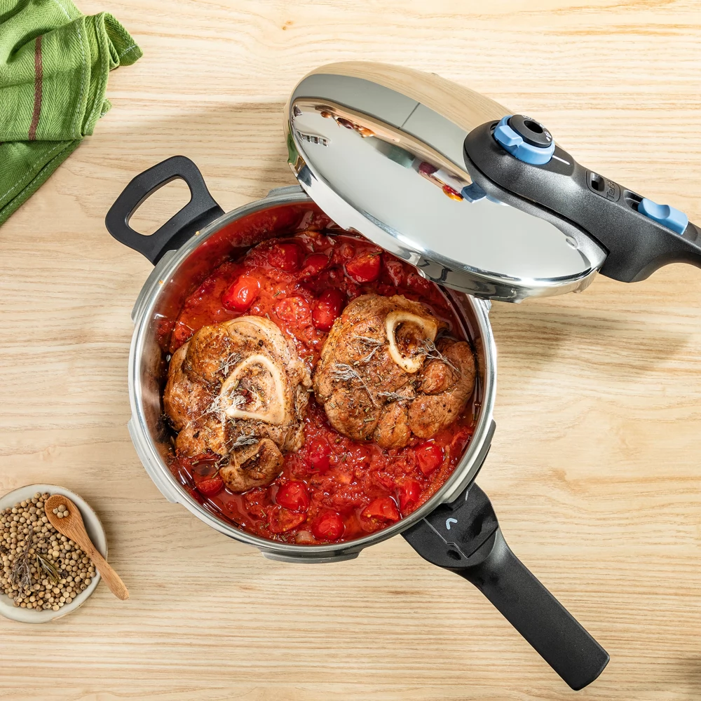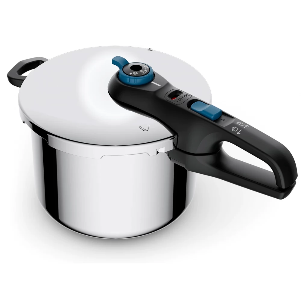 Fast and modern cooker Cook stylish meals quickly! The Tefal Secure Trendy cooker is characterized by a stylish design in colorful shades, so it can be a perfect addition to your kitchen! Cook up to twice as fast* and use one of the two cooking programs to optimize the cooking process – one for nutrient-packed vegetables and one for lightning-fast preparation of tender meats. The Secure Trendy cooker is designed to really withstand anything. The 5-stage safety system ensures complete peace of mind and is fully compatible with all stoves, including induction.