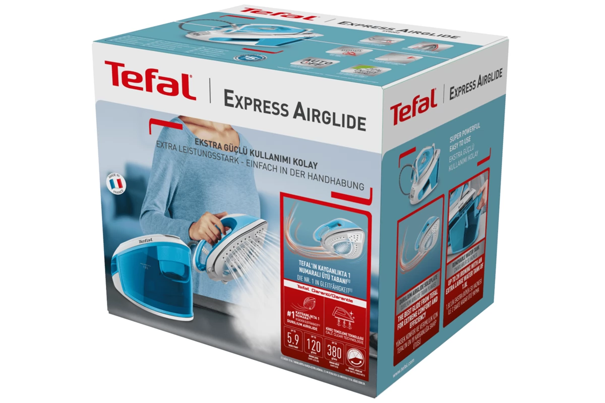 Express Airglide Steam Station Powerful enough to remove creases from any fabric, the Express Airglide Steam Station is a fast and reliable garment care solution for all your ironing needs. Extra strong steam - 120 g/min continuous steam output, 380 g/min powerful steam boost for stubborn creases and 5.9 bar pump pressure - combined with Calc Clear technology for easy maintenance and long-lasting performance.