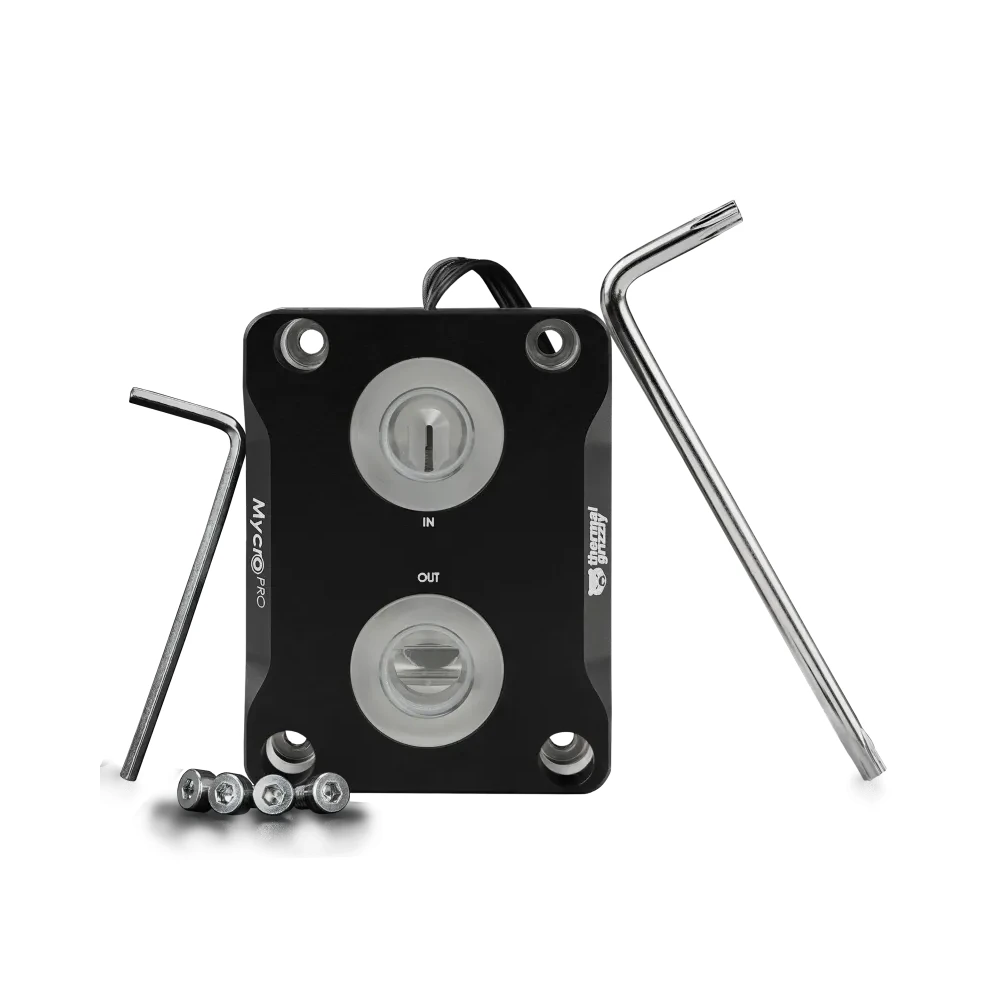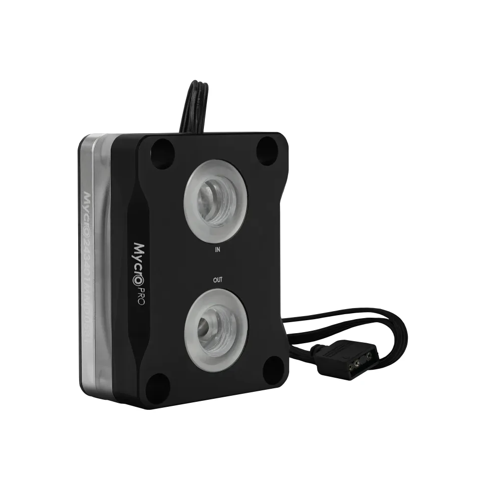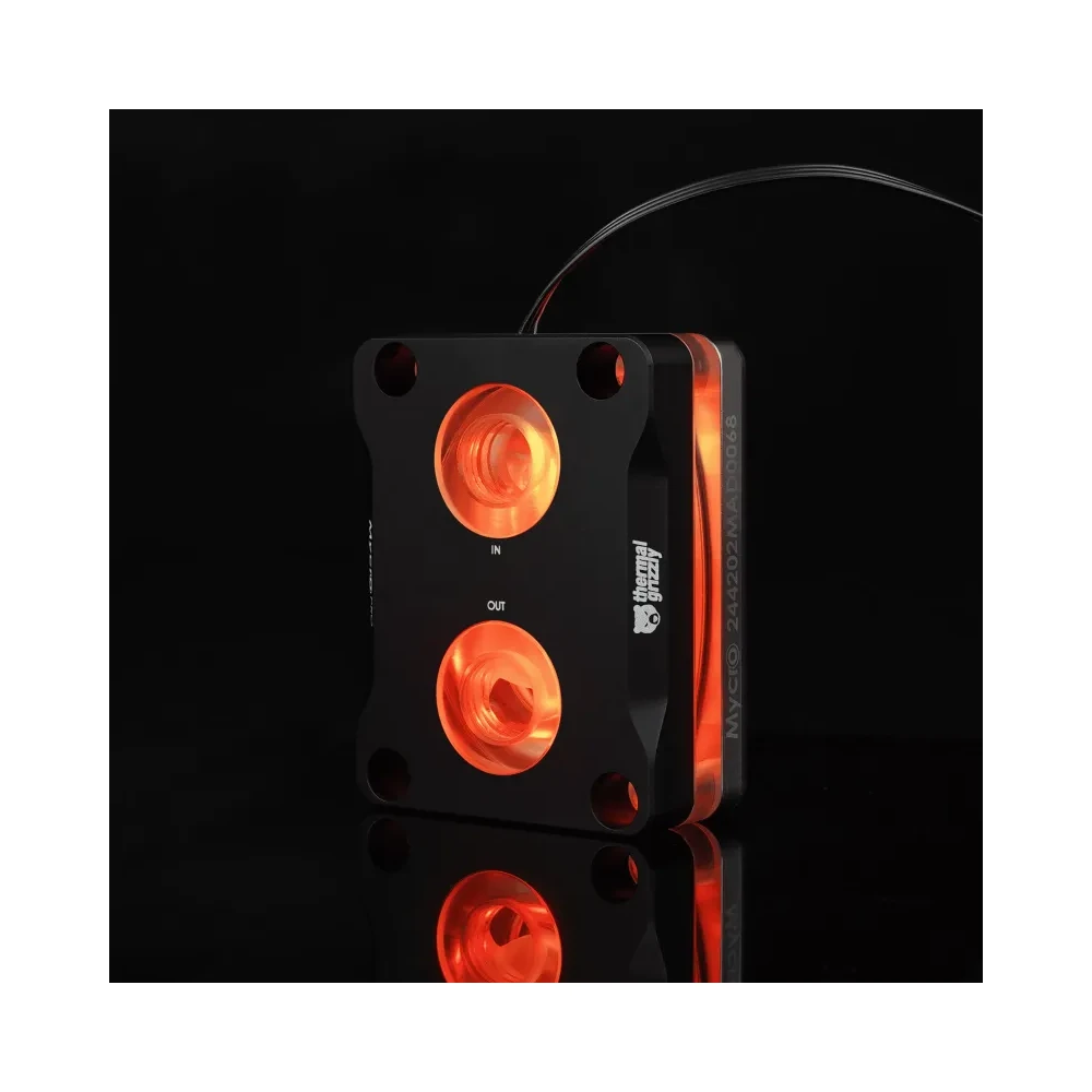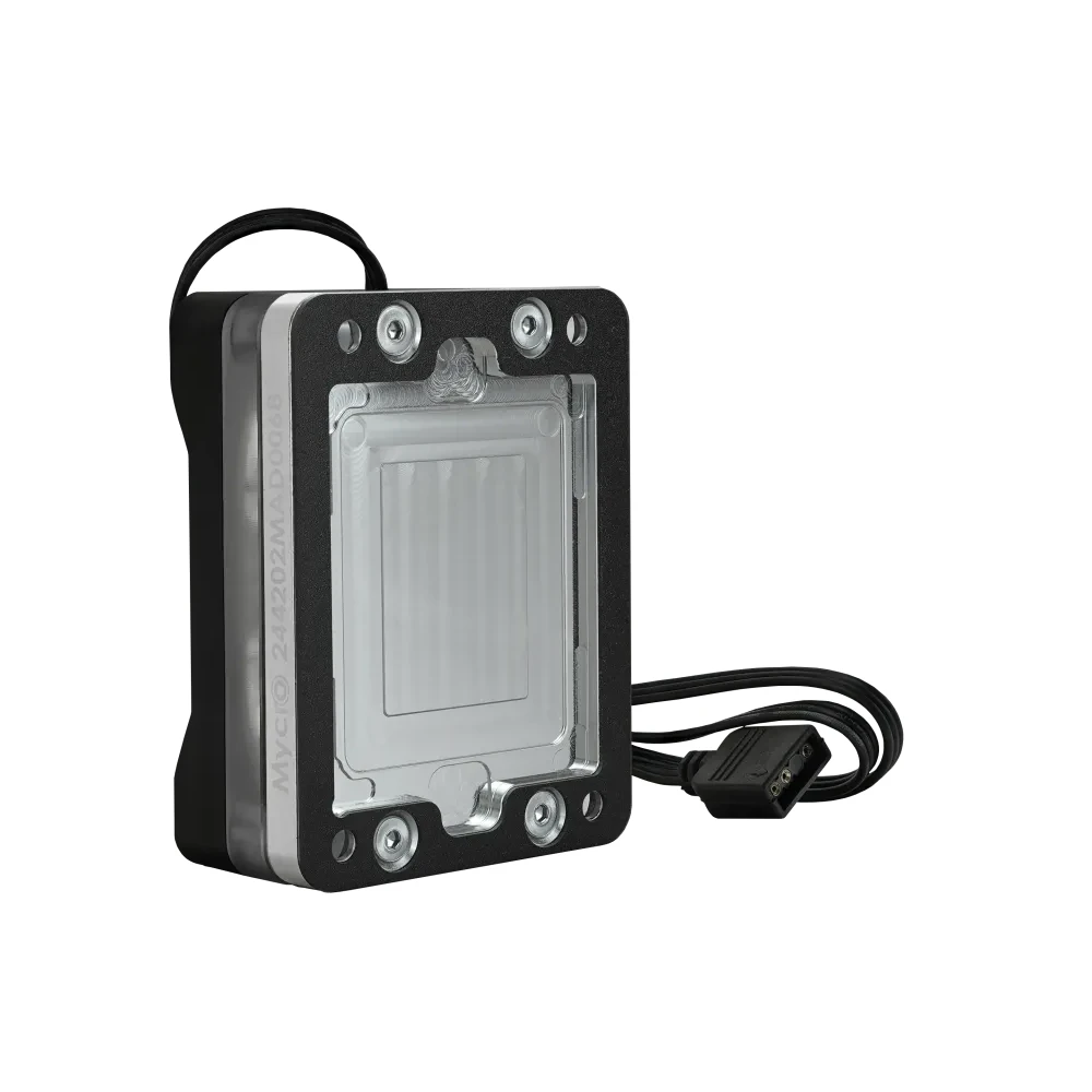 Thermal Grizzly Mycro Direct-Die Pro RGB V1 CPU cooling block for Intel LGA 1851 sockets with controllable ARGB lighting and 2 G1/4" water cooling connections.
