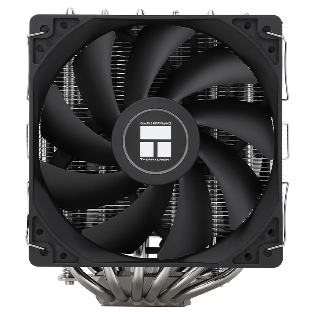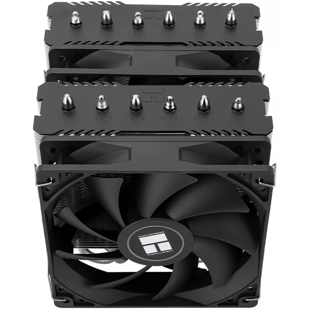 Double-tower, heat-conducting tube universal CPU cooler with 2 120mm PWM speed control fans. Another special feature of the cooling is the nickel-plated copper core and the elegant black heatsink covers.
