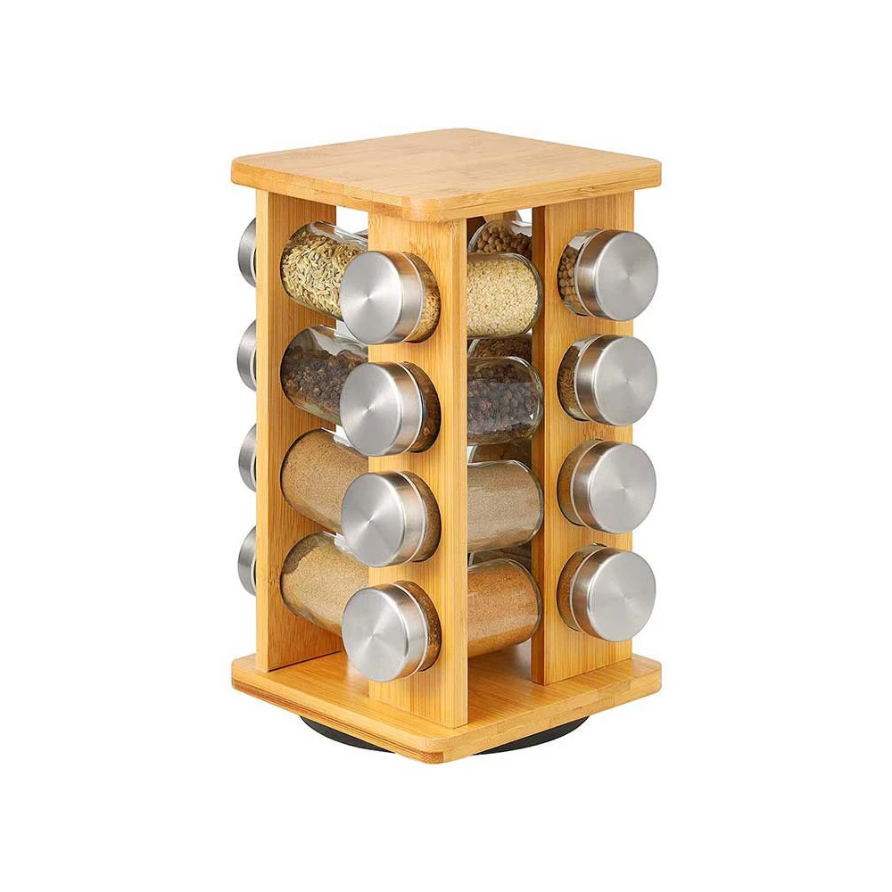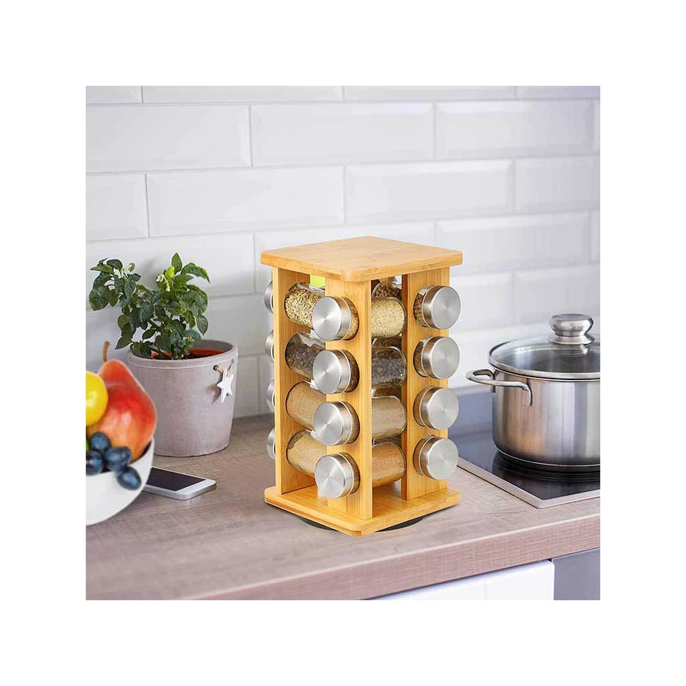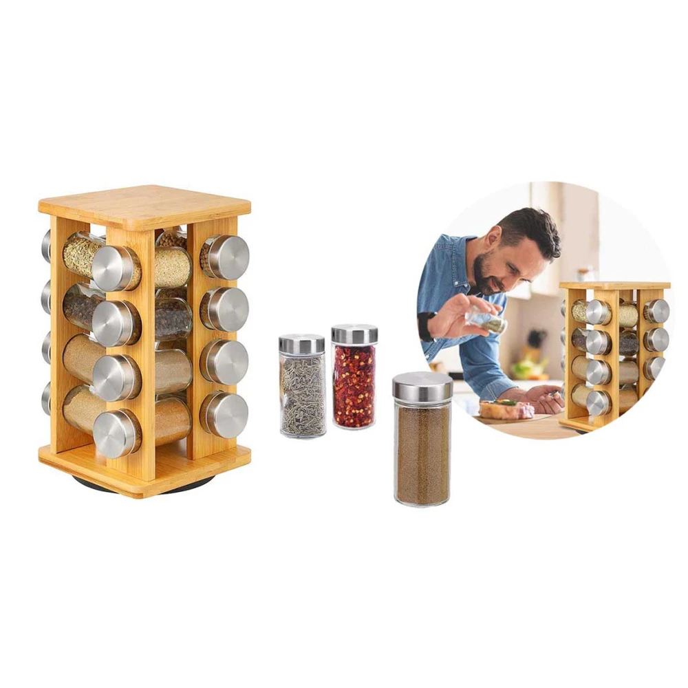 The rotatable bamboo spice rack makes every moment of cooking easier. Thanks to the 16 durable, transparent glasses, what you are looking for is always transparent and close at hand.
