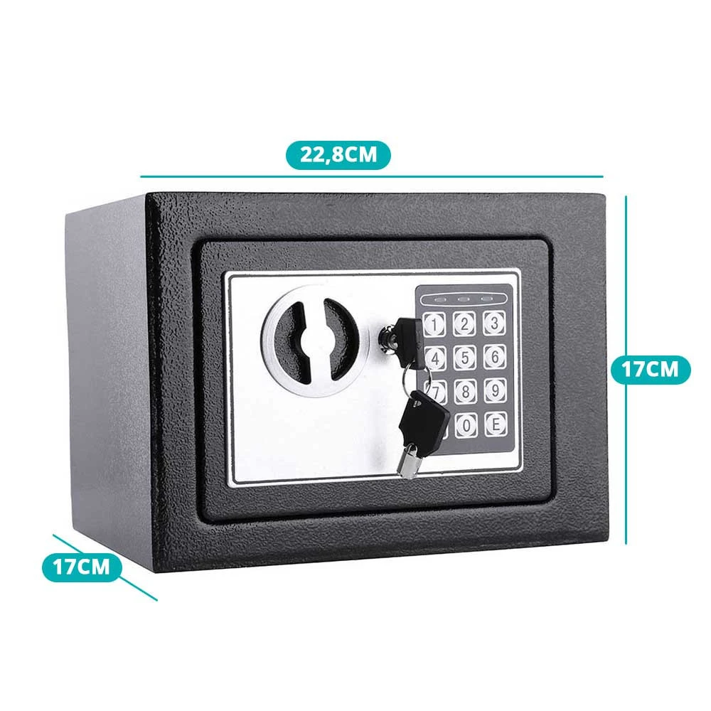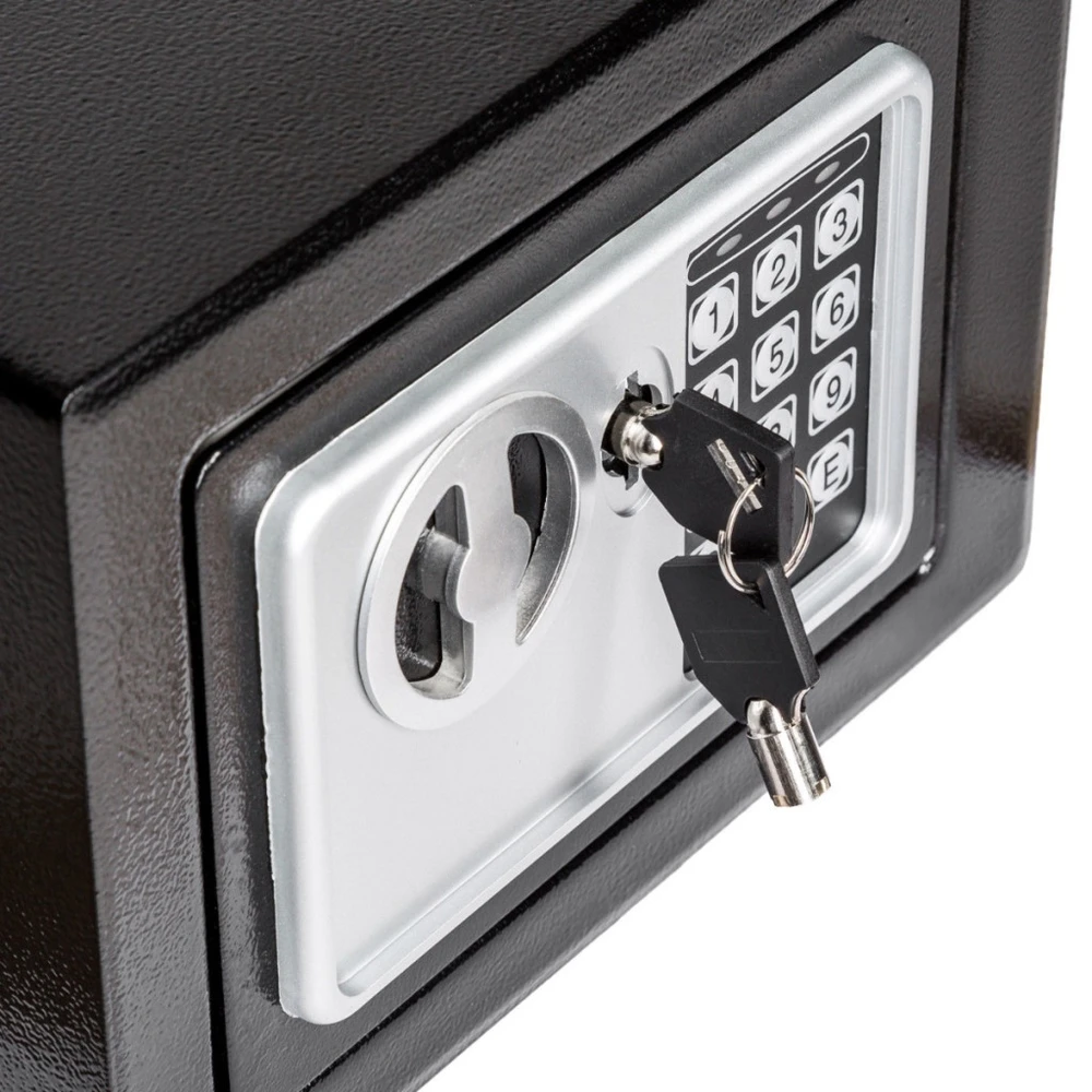 This compact security box is an excellent solution for protecting your valuables at home, office or shop. It has a digital lock, can be opened with a PIN code and a key, and thanks to its screwable design, it can be stably attached to the floor or wall.