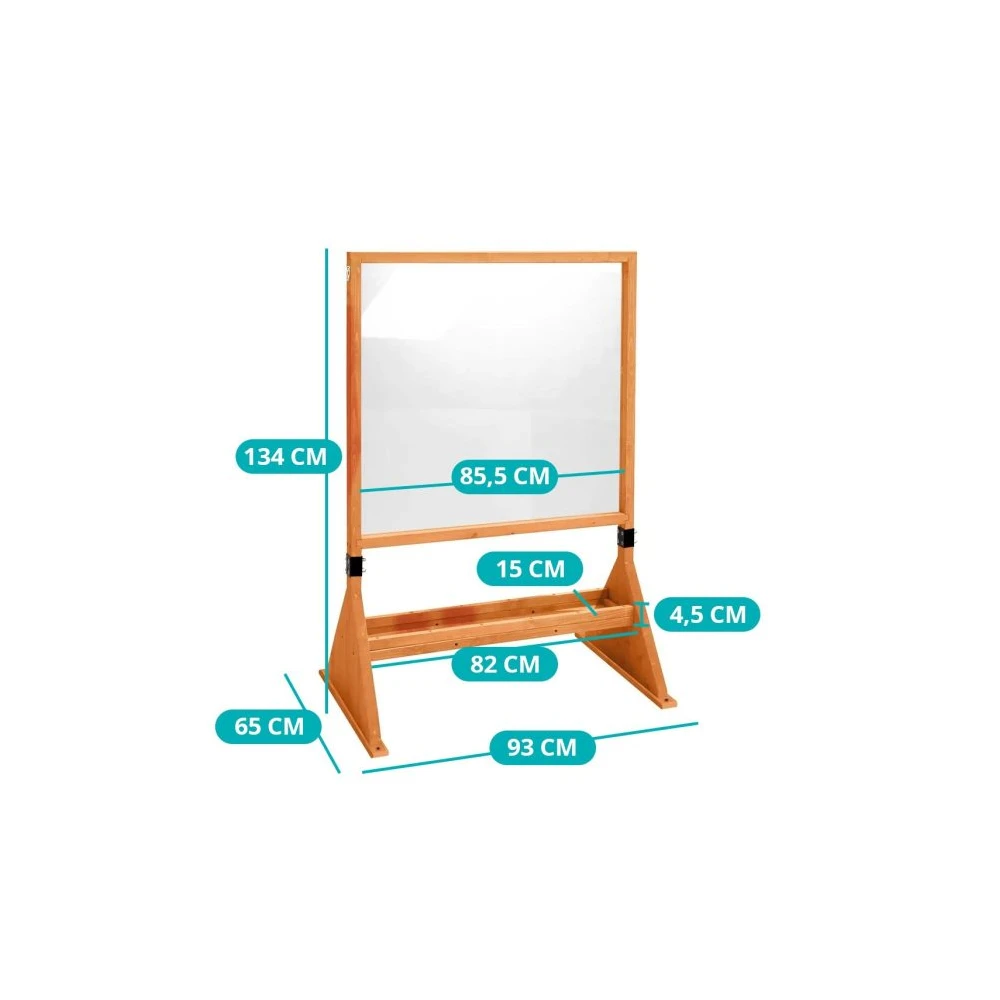 This transparent plexiglass drawing board offers a special experience: children can incorporate the people behind the board, objects, or even the view of the garden into their creations. Thanks to the double-sided design, several people can use it at the same time, which is especially exciting when playing together.