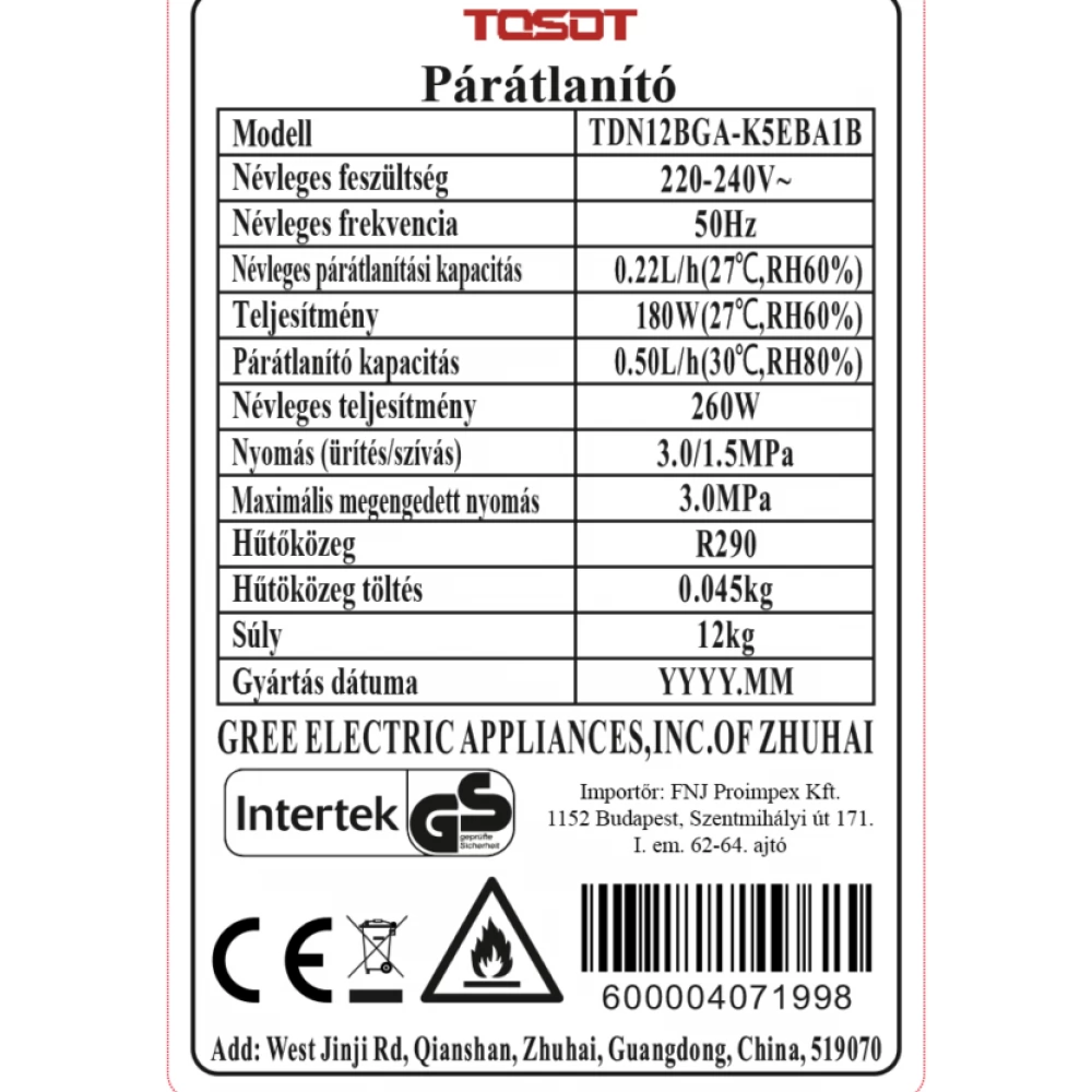 TOSOT TDN12BGA-K5EBA1B Dehumidifier 260 W 12 l white