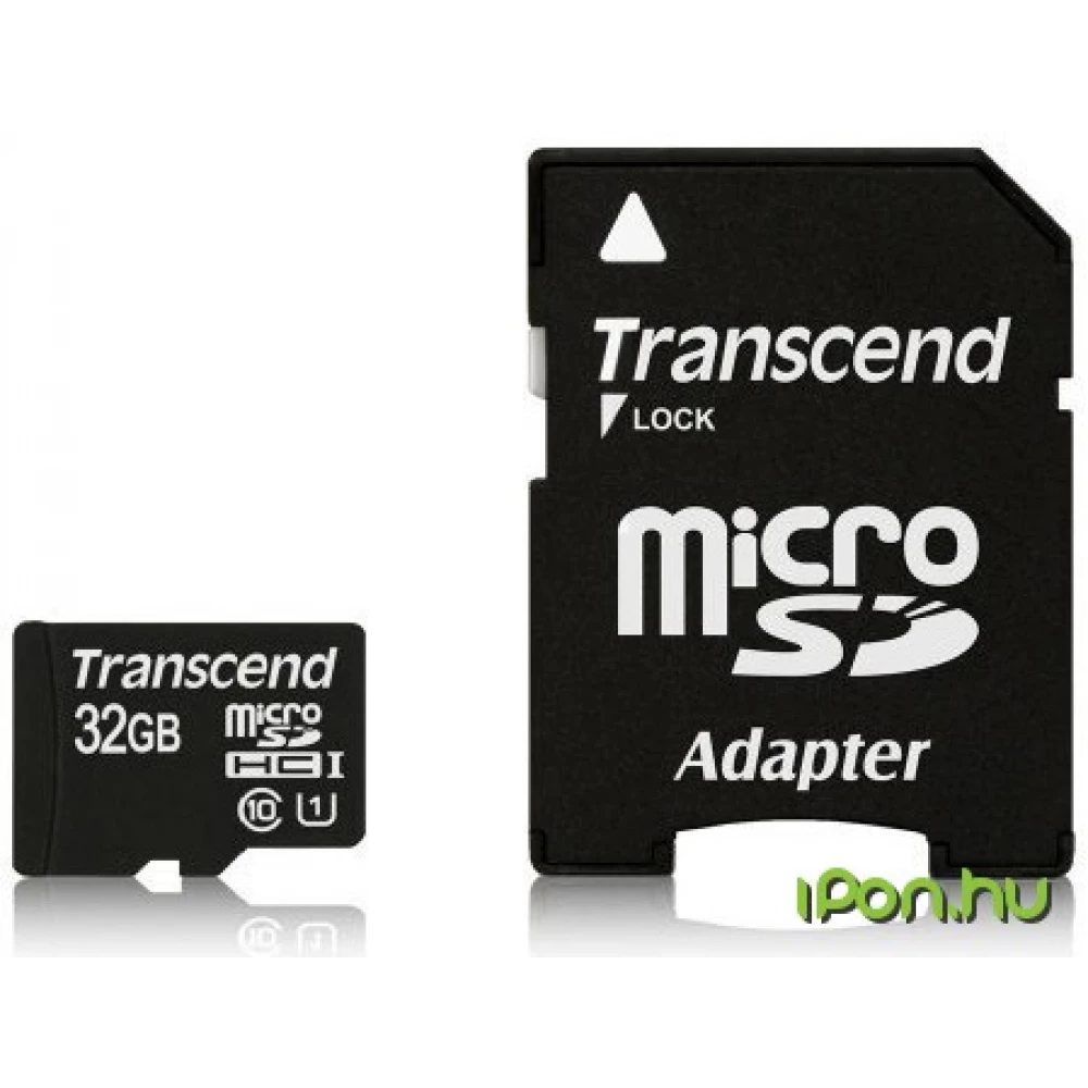TRANSCEND 32GB MicroSDHC Class 10 UHS-I 400x with memory card adapter.