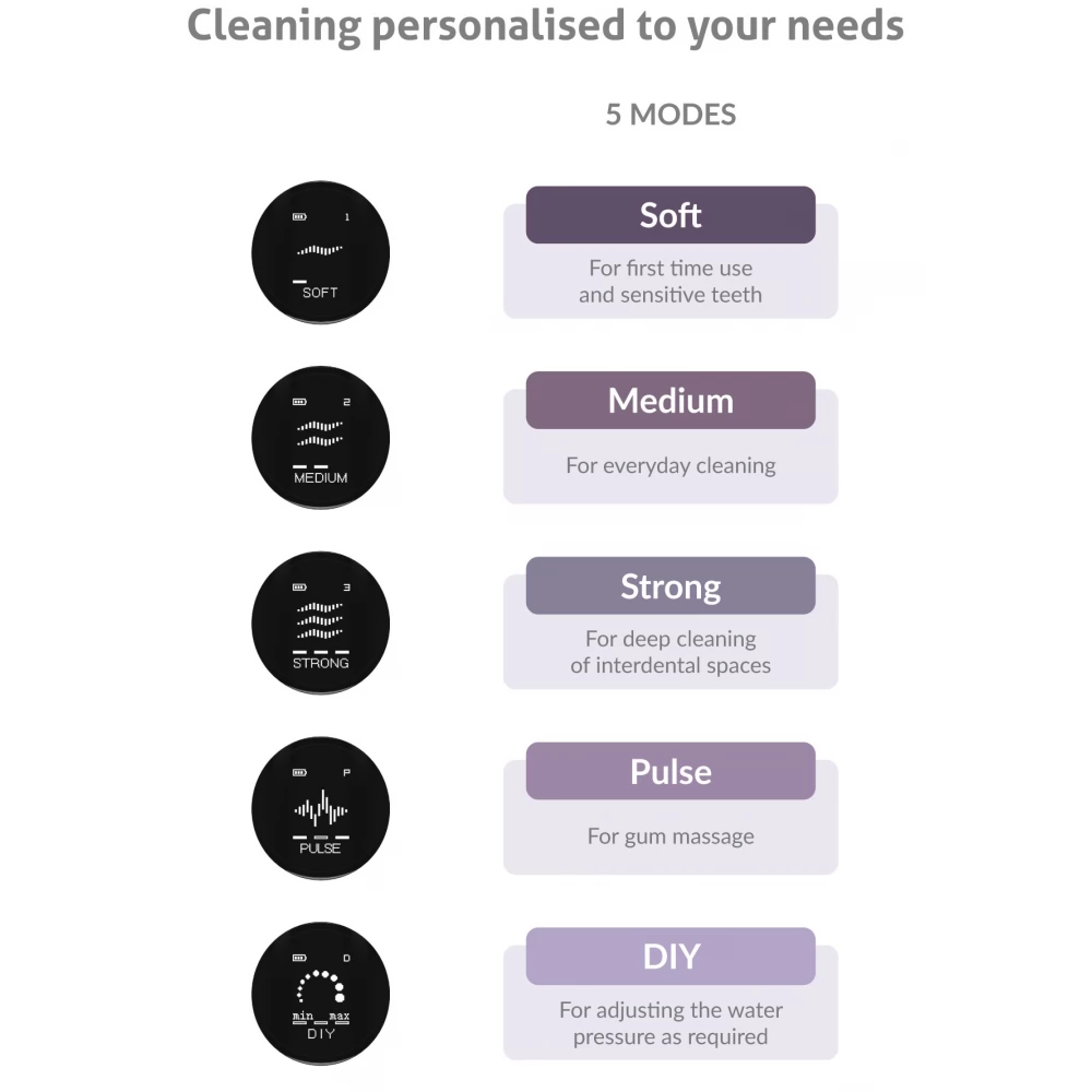 Thanks to its compact design, you can take the oral shower with you anywhere. The battery lasts for 14 days on a single charge, so you don't even have to take the charger with you on vacation. The charging cable always ends with a USB connector, so the oral shower can also be charged from a power bank. The AquaFloss oral shower is equipped with a time switch and a Memory function, which remembers the last used mode. Thanks to the DIY function, you can precisely adjust the intensity of the water pressure and create your own mode.