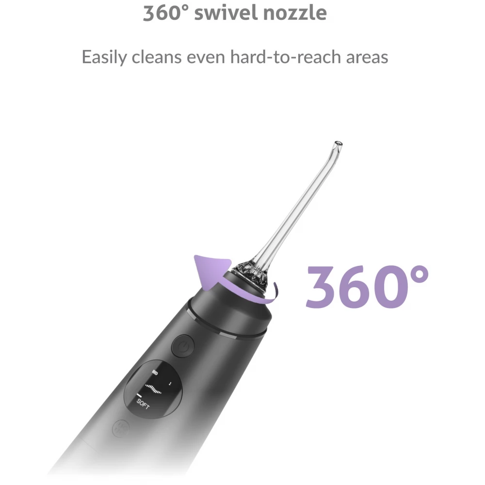 With the AquaFloss Compact C300, you can choose from five cleaning modes, so you can completely customize your teeth cleaning experience. For an extra dose of freshness and hygiene, you can pour mouthwash into the 300 ml container in addition to water. The shower nozzle, which can be rotated 360 degrees, reaches even the smallest spaces between teeth and removes up to 99% of plaque. Together with the sonic toothbrush, it reduces the risk of tooth decay and gingivitis, and saves you from unpleasant visits to the dentist and unexpected expenses.