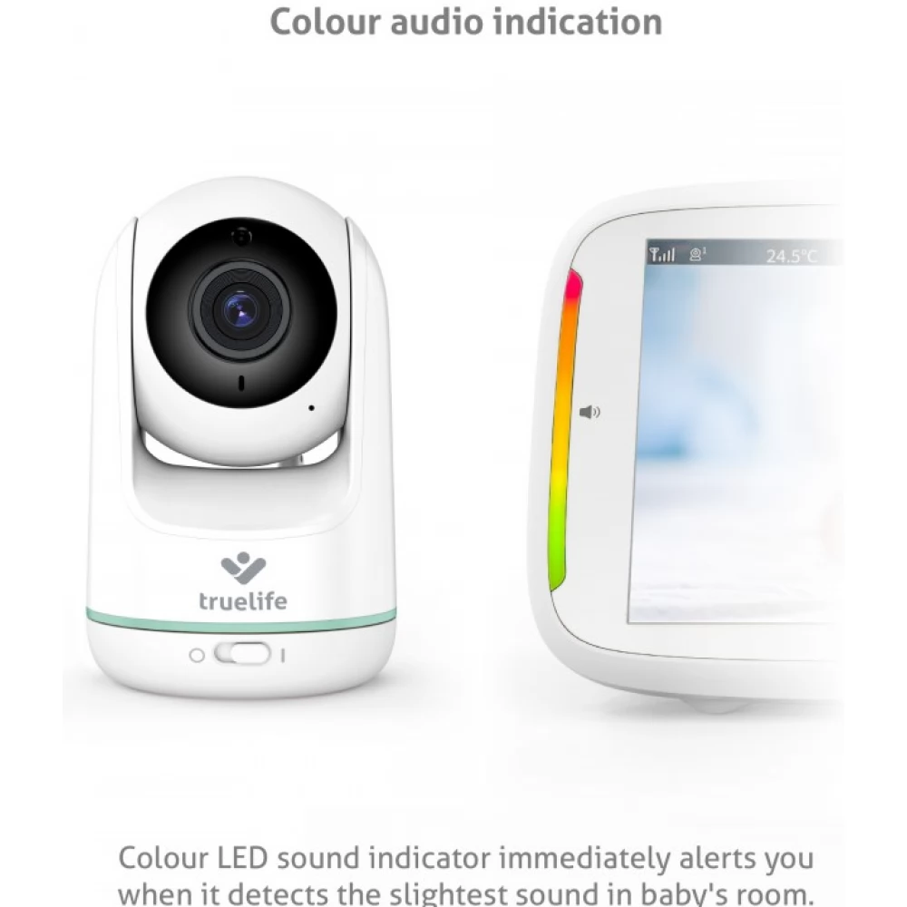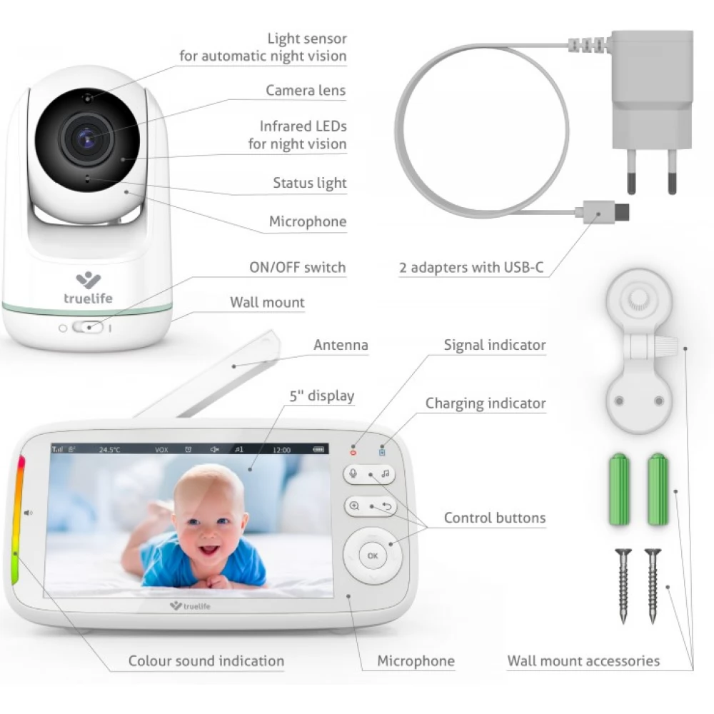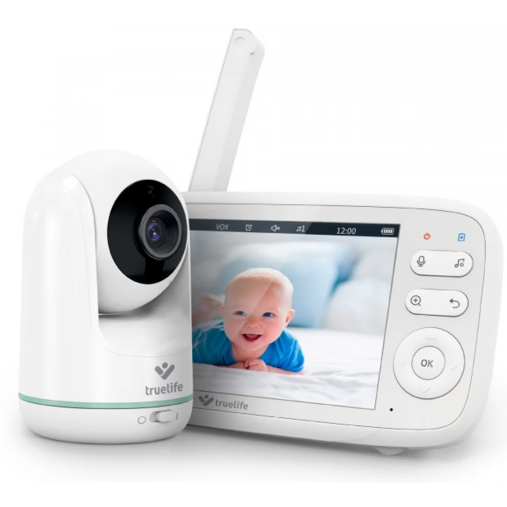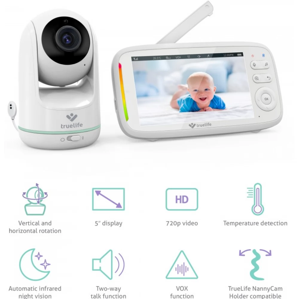 Every parent wants to keep an eye on their child, be it a baby or an older child. With the TrueLife NannyCam R5 360° rotatable baby monitor, you can be sure that you will record every movement and sound with crystal clear clarity. The state-of-the-art 720p camera and a 5-inch LCD paired with a parent unit provide an impressive, sharp image at a range of up to 300 meters. Equipped with automatic night vision, the safety of your child is uncompromising, even in the dark. The parent unit, available in several languages, allows you to control the rotation of the monitor, provides a comprehensive view of the room and the LED buzzer indicates activity. The baby monitor doubles as a thermometer and has a two-way communication system, a library of 8 soothing lullabies and a feeding reminder. Despite the long battery life, you can further optimize energy consumption by using VOX mode.