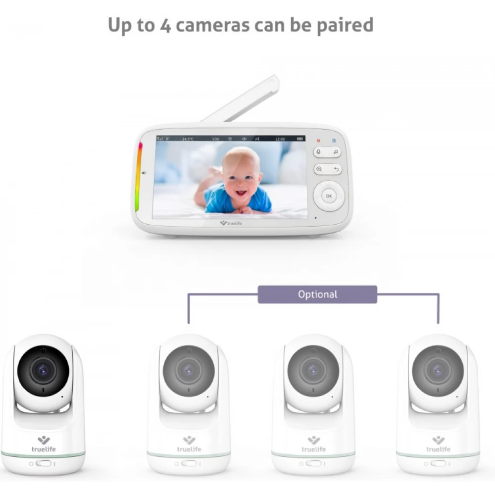 The baby monitor, which can be connected to up to 4 cameras, provides up to 8 hours of screen-on operation. Battery life increases to 16 hours in VOX mode, where the display of the parent unit lights up only when sound is detected. This versatile monitor can be mounted on a wall using the supplied kit, or can be attached to a cot using the TrueLife NannyCam holder, which can be purchased separately. This ensures a clean and drill-free installation, even on the go.