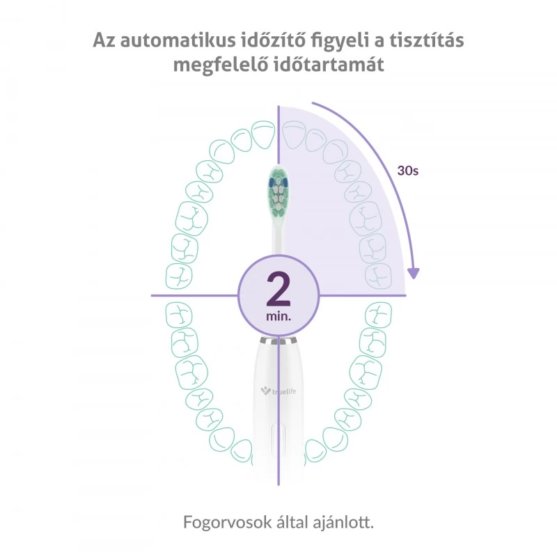 The TrueLife SonicBrush Clean30 sonic brushes in the set have 5 cleaning modes that make it easier to take care of your teeth and gums every day. The Clean mode takes care of normal cleaning, the Whiten mode takes care of more resistant plaque, which also helps to whiten the teeth. A perfectly bright smile is ensured by the Shine mode, which effectively removes pigment spots caused by, for example, coffee or tea. If you have more sensitive teeth and gums, you will appreciate the Sensitive mode. Massage mode contributes to healthier gums by stimulating them. The ideal cleaning time is 2 minutes, but you don't have to pay attention to them, the timer takes care of it. After 30 seconds, it also warns you that it is time to move on to the next part of the denture.