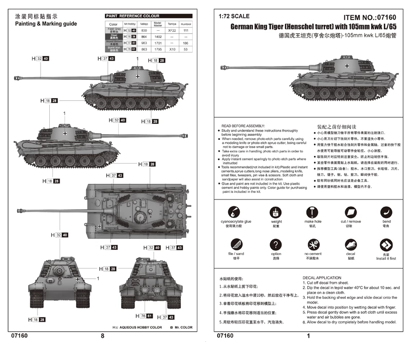 TRUMPETER 1/72 king Tiger tank model 105mm kwk L/65 guns and Henschel tower