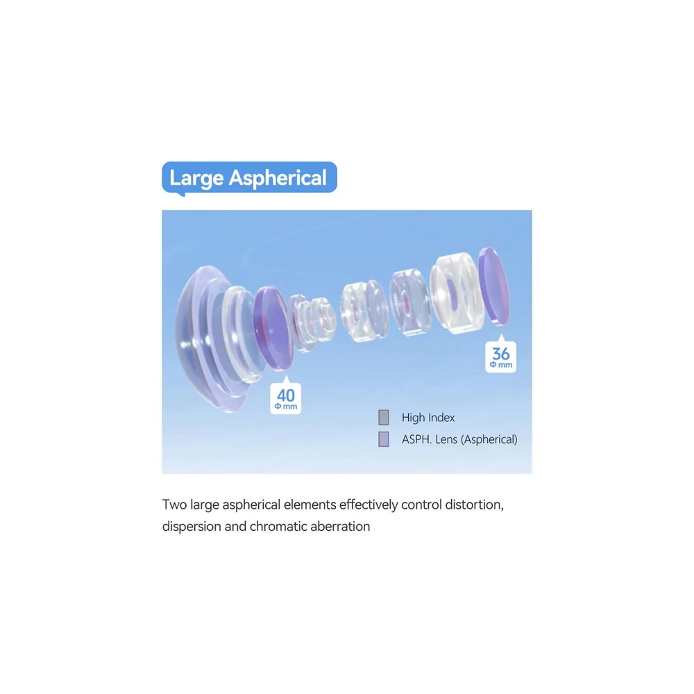 17 lens elements in 11 groups, including two aspherical elements to minimize distortion and chromatic aberration.