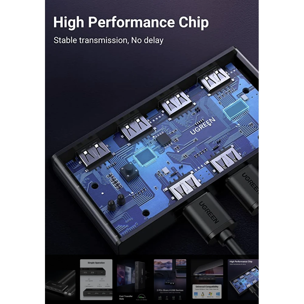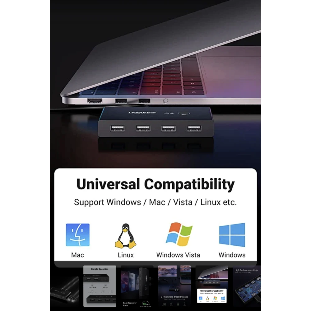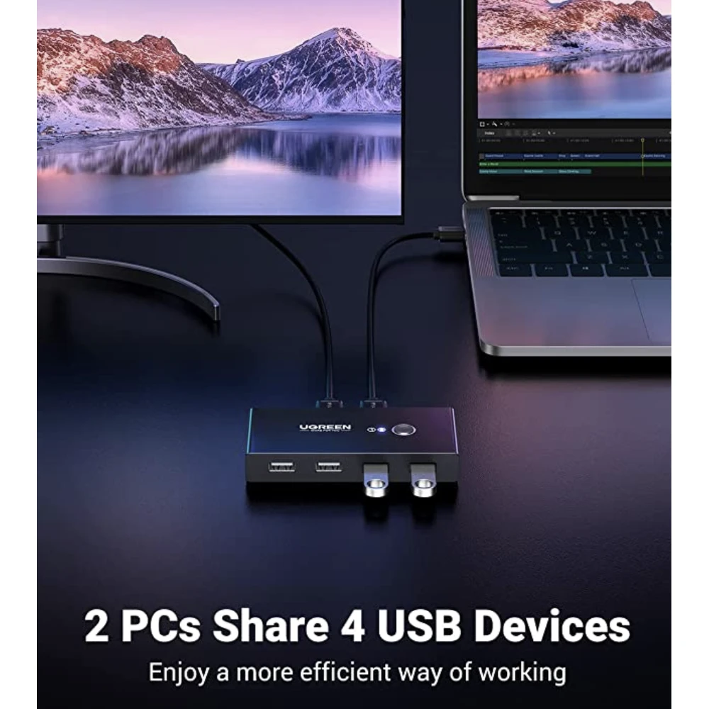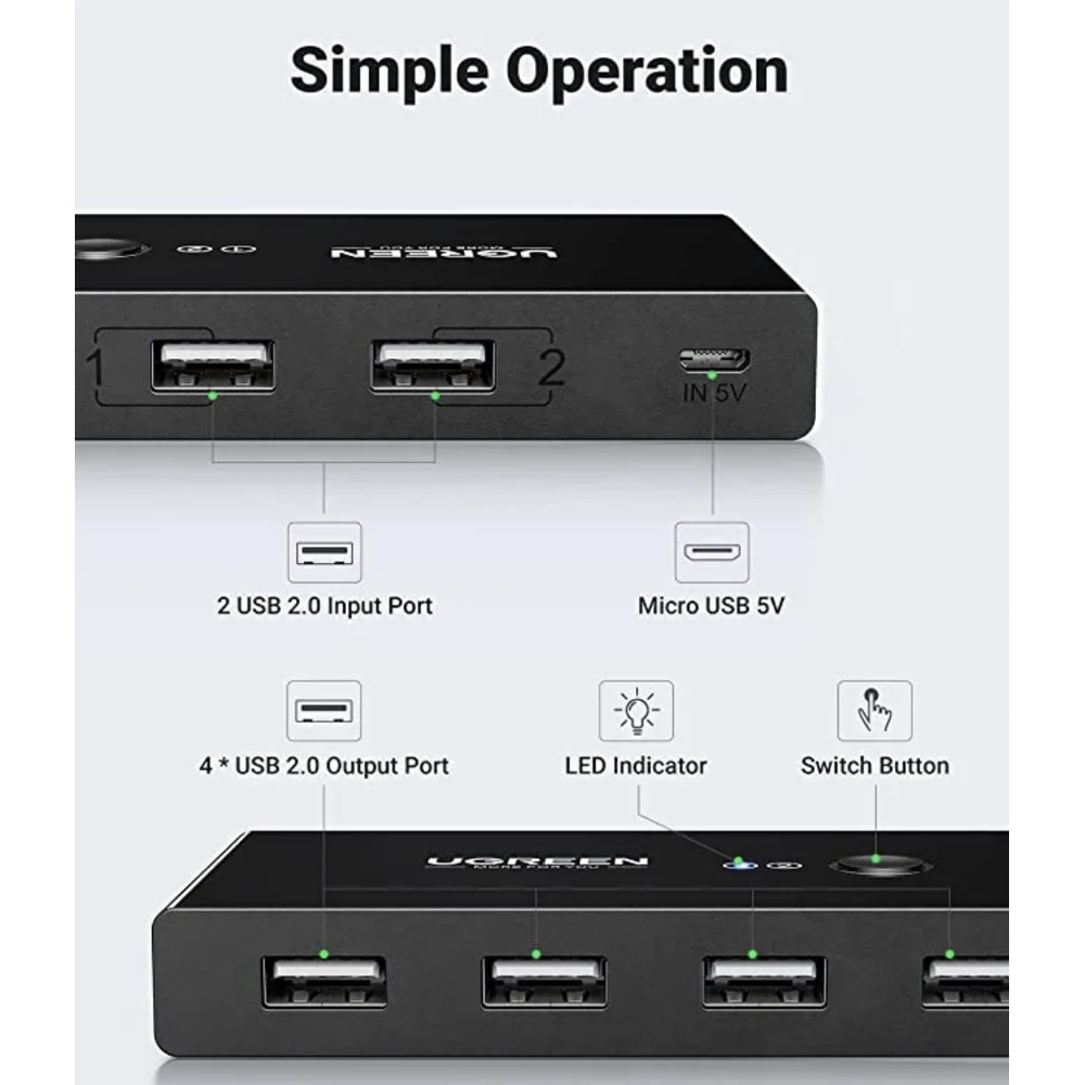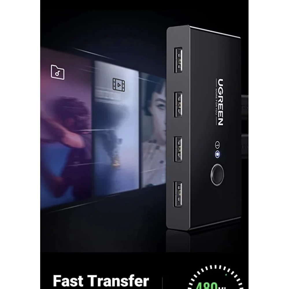 The UGREEN USB 2.0 switch allows up to 2 users to share 4 USB 2.0 peripheral devices without constantly changing cables or installing complicated network sharing software.