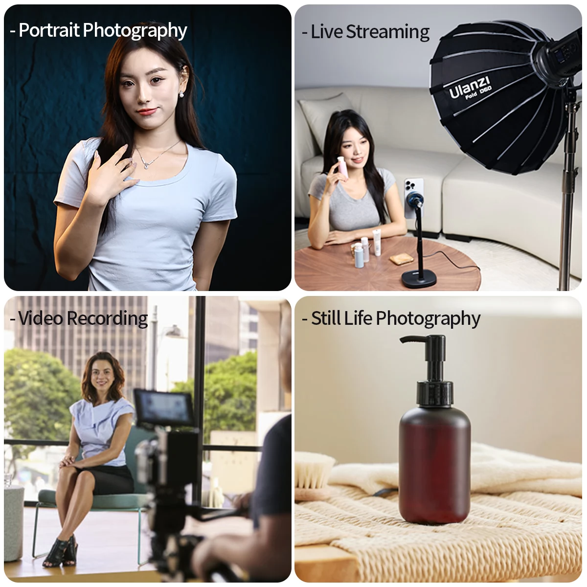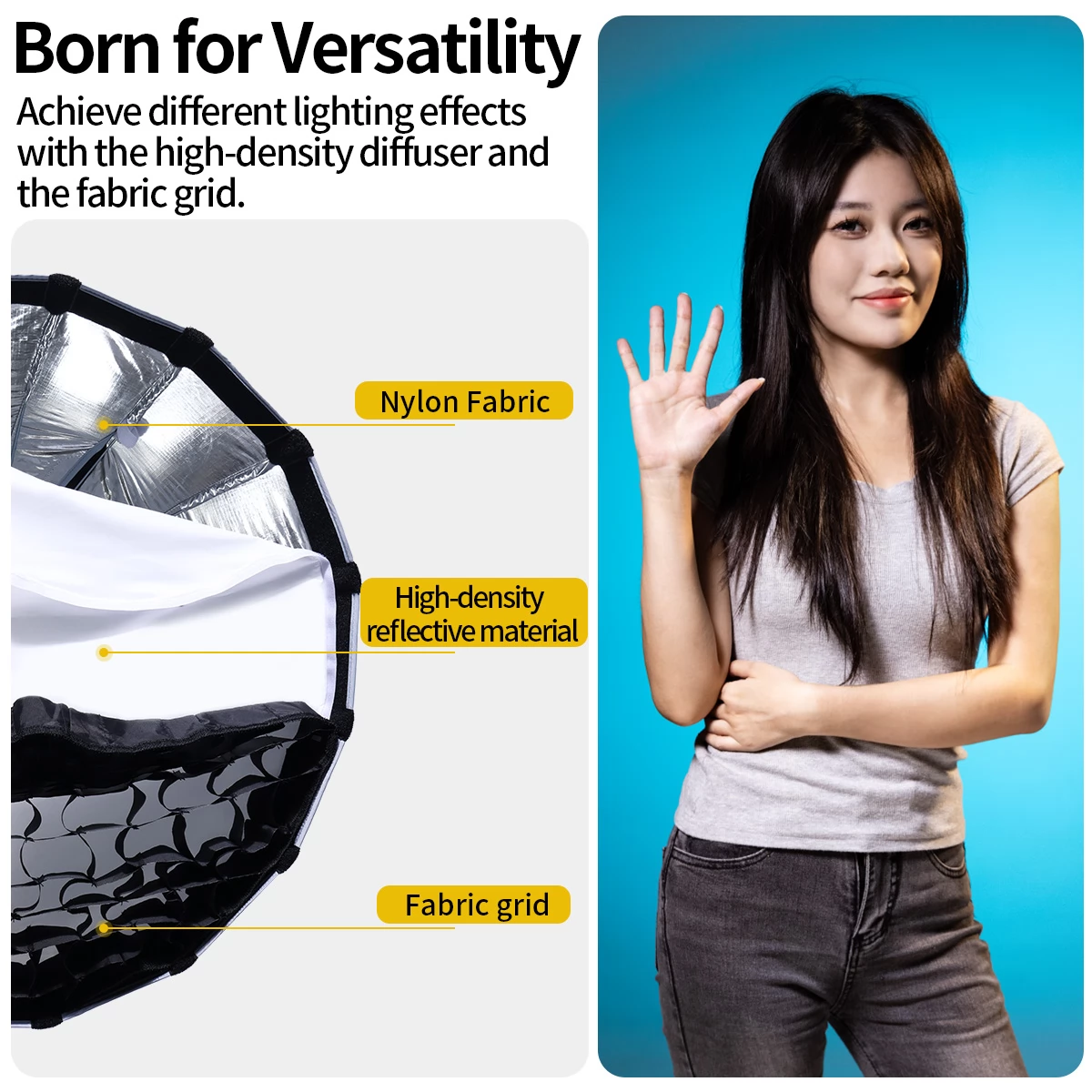 The Ulanzi D60 is opened to the Parabola Softbox is a compact and professional light-shaping tool that is the perfect choice for studio and on-site photography. The 60 cm size, honeycomb grid and mini bowens connecting allow precise light control and even soft illumination.
