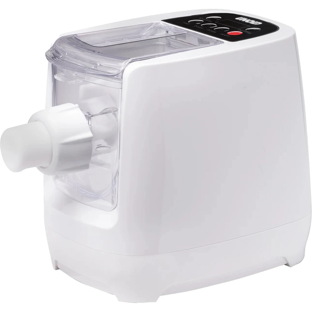 The Unold Nora pasta maker is the perfect tool for making homemade pasta. The 260-watt device has a white plastic housing, equipped with an LED display and function buttons. It helps you make pasta with three automatic dosing programs, with vertical pasta dispensing.