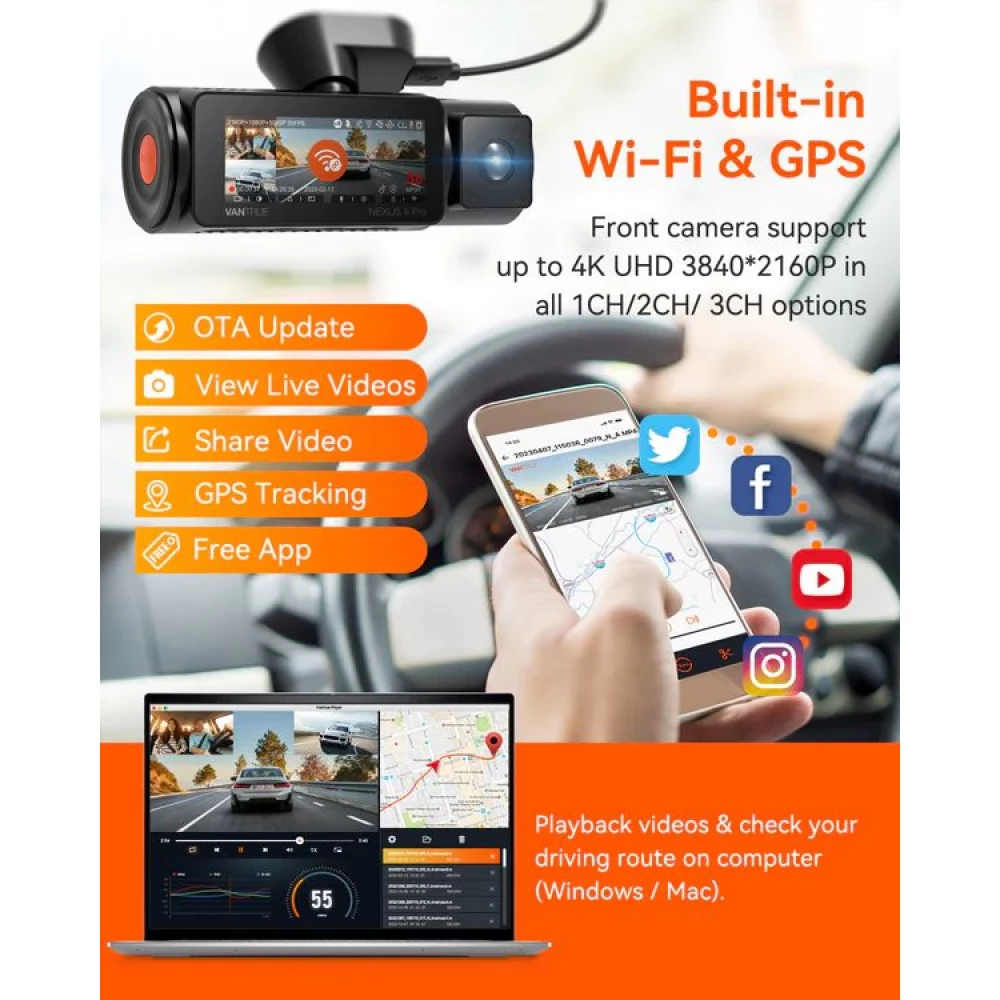 4K UHD resolution car dash cam with 3-channel recording solution. Front, rear and interior (passenger) recording.