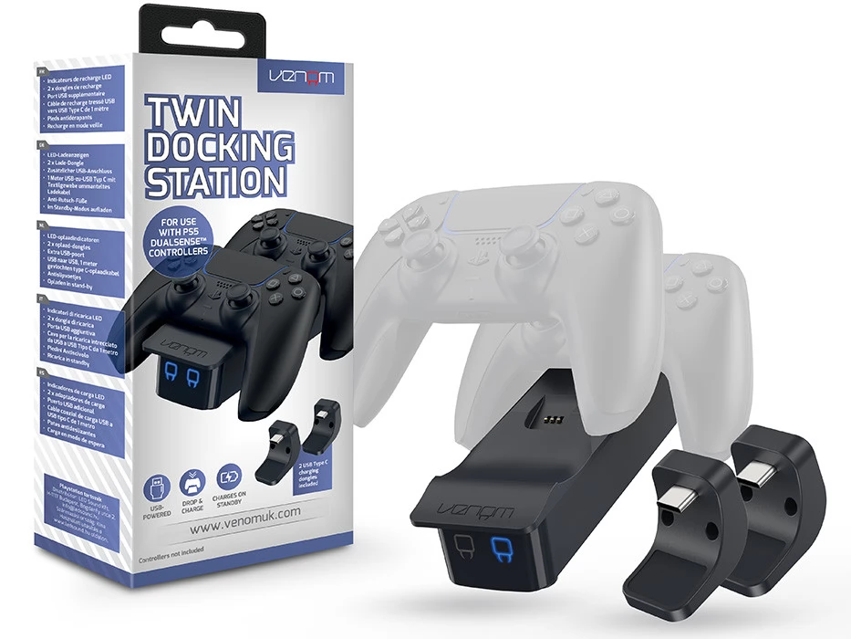 - A red LED indicates charging, which turns blue when the batteries are fully charged