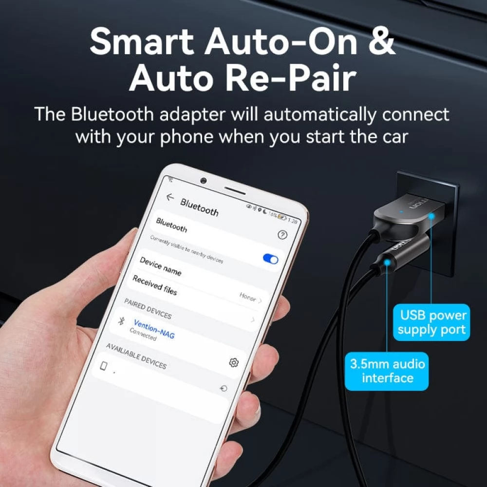 VENTION USB Car Bluetooth5.0 Audio Receiver With Coiled Cable 1.5M grey