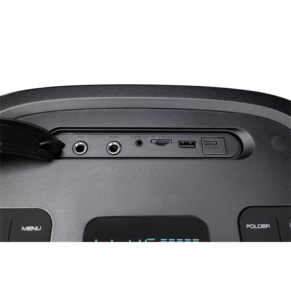 This karaoke speaker has an FM radio function and a USB-C connector to charge the connected external device. The amplifier has a maximum output power of 130 W RMS. The battery has a capacity of 12000 mAh, which allows up to 11 hours of long -term operation at medium volume and can work an impressive 2.5 hours at maximum volume!