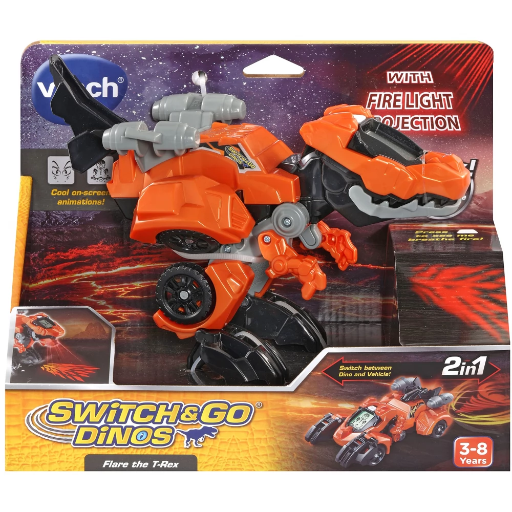 The Switch & Go Fire dinosaur figures can transform from dinos to vehicles and from vehicles back to dinosaurs in the blink of an eye. Another special feature of the T-Rex robot is that a red LED light imitates the fire-breathing of the dinosaur and the driving of the vehicle.