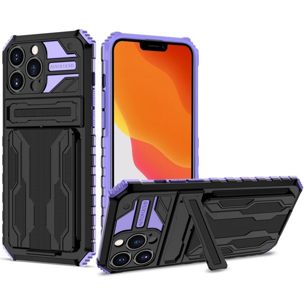 WOOZE Transformer plastic back panel protection case silicone internal moderately shockproof kickstand kártyatartóval Samsung Galaxy S23 Plus SM-S916 fekete/lila