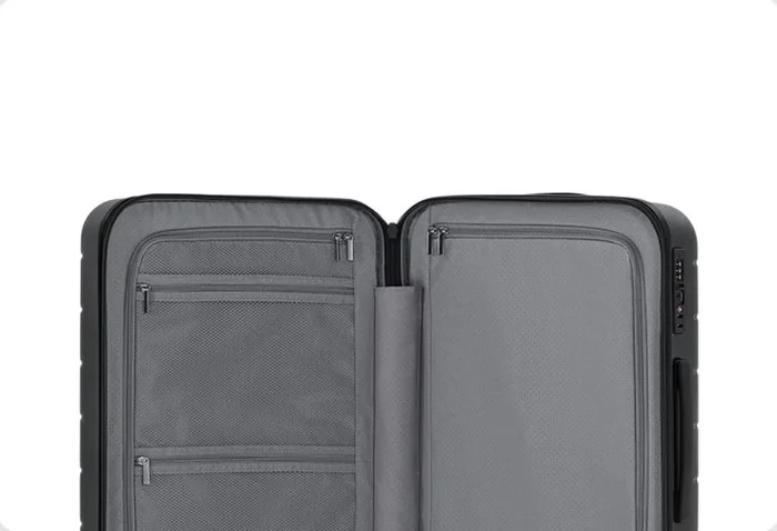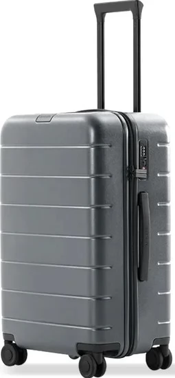 Polycarbonate suitcase with 4 swiveling wheels, pull-out top handle, TSA combination lock.