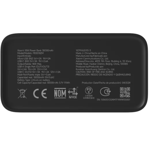 The Xiaomi 30000mAh 18W powerbank has a large capacity, but in terms of dimensions, it is a fairly compact device that weighs enough to be your inseparable companion on any trip and trip. The power bank, made of durable plastic, withstands the road well, wear and micro-scratches are not visible on its body. The special corrugated surface of the case improves grip: the power bank fits securely in the palm of your hand and does not fall out even while charging on the go.