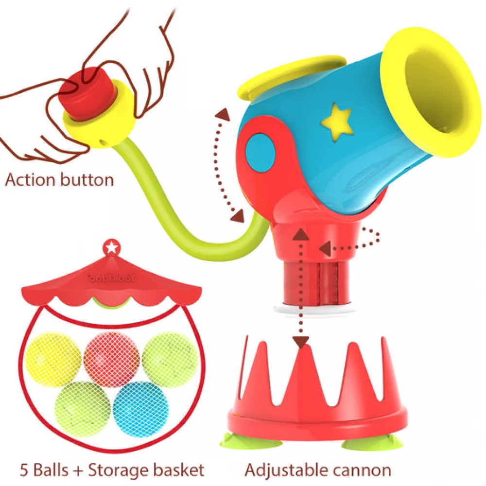 A fun bath toy that consists of 2 main parts: a water cannon that can shoot colorful balls and a touchable hoop into which you have to shoot the balls.