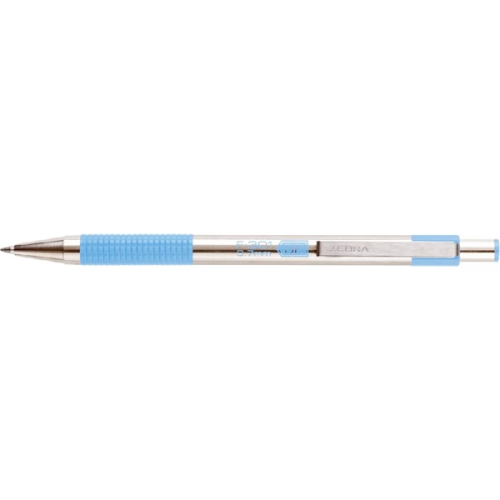 The F-301 Pastel push-button metal ballpoint pen with a pastel blue handle. Replaceable insert (F insert), ball diameter 0.7 mm, writing thickness 0.24 mm.