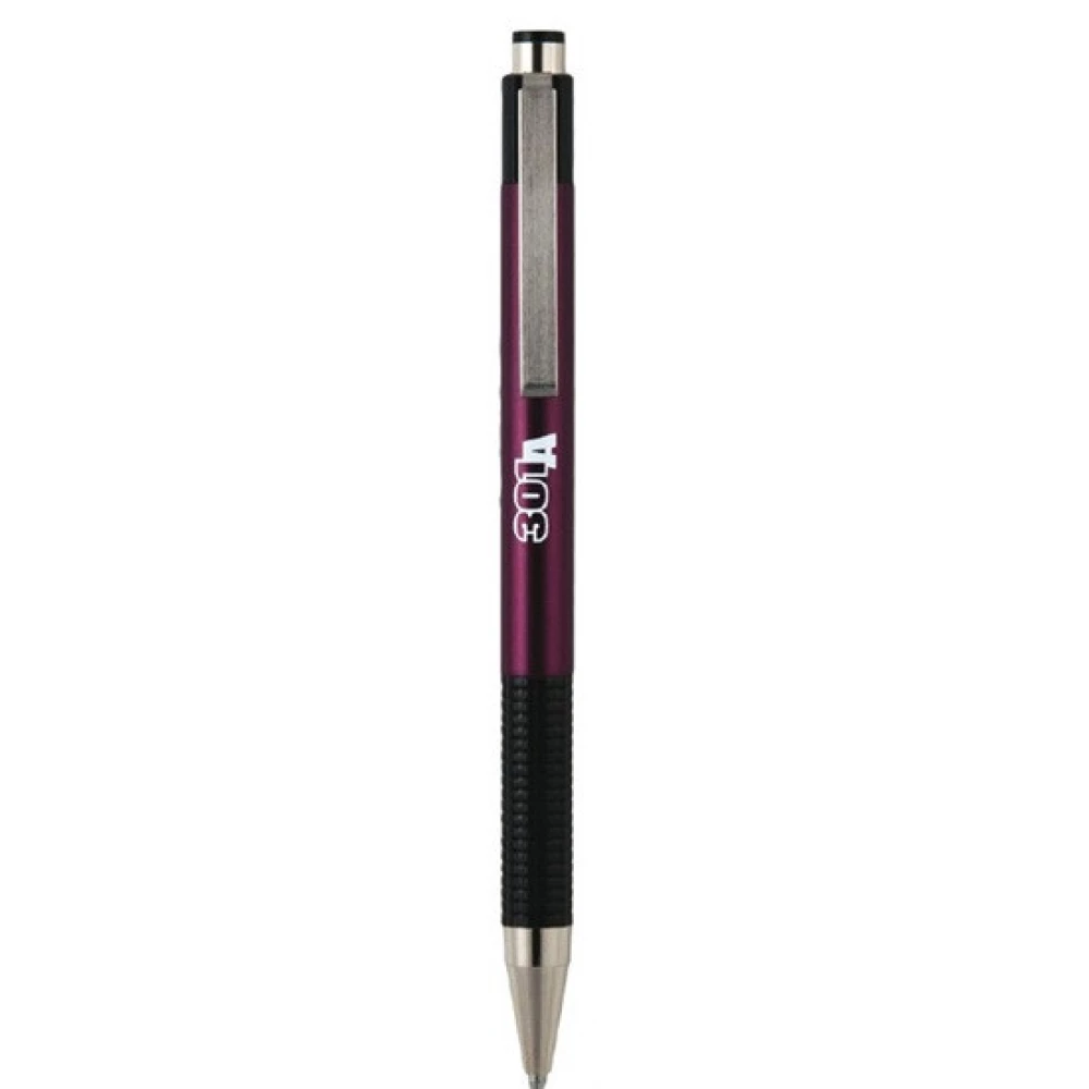 - Ballpoint pen with a stainless steel body and ribbed handle